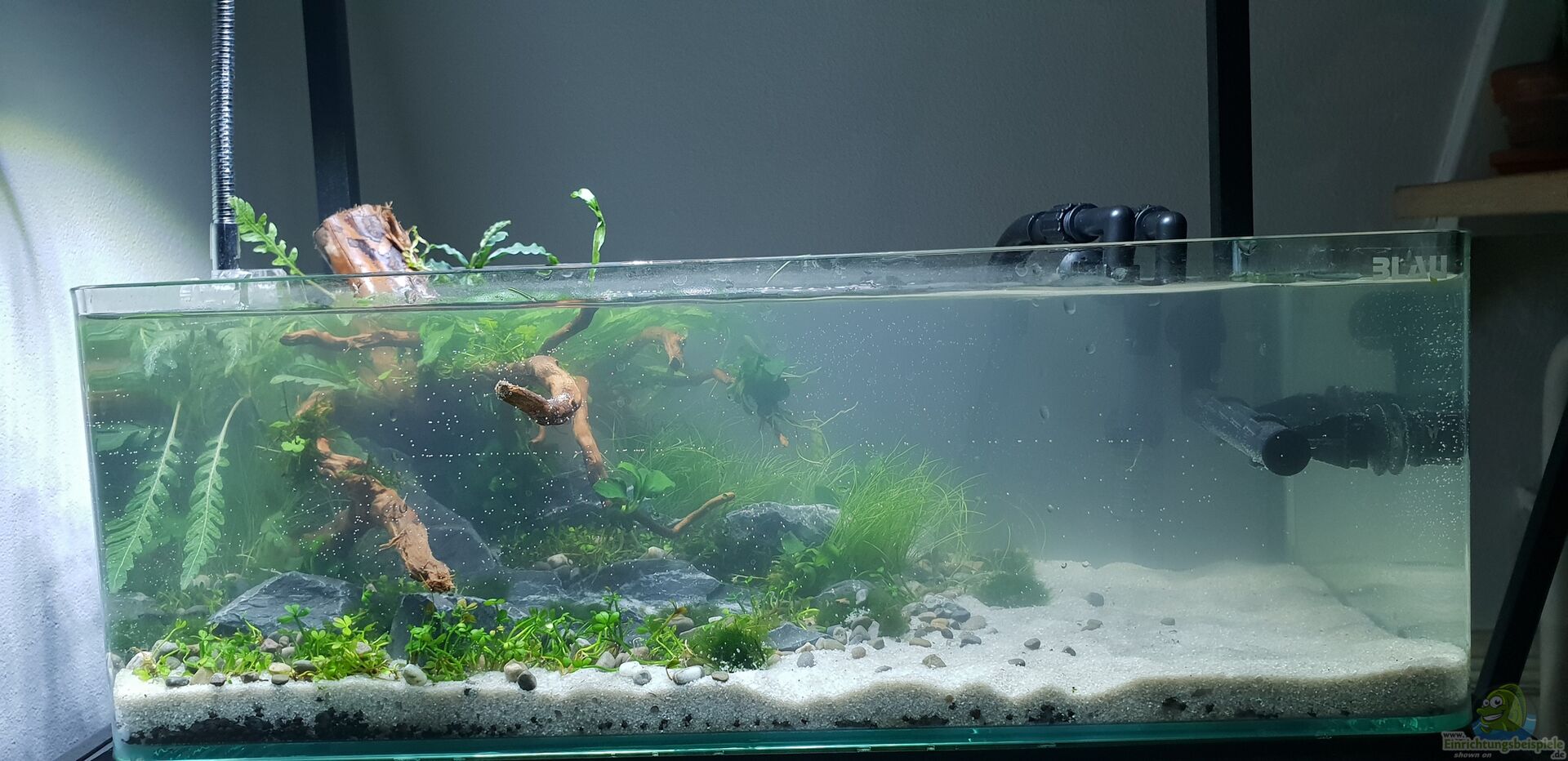 Besonders flaches Rechteck-Aquarium mit 17 Liter Inhalt und abgerundeten Ecken an der Frontscheibe. Hergestellt aus besonders hochwertigem Floatglas(Hersteller Blau Aquaristic) Erstes Aquascape/Naturaquarium, das einen seichten Nebenfluss darstellen soll bei dem Wurzeln hineinragen und eine dichte Randbepflanzung aufweisst und durch die Bepflanzung und Schwimmpflanzen teilweise beschattet wird.