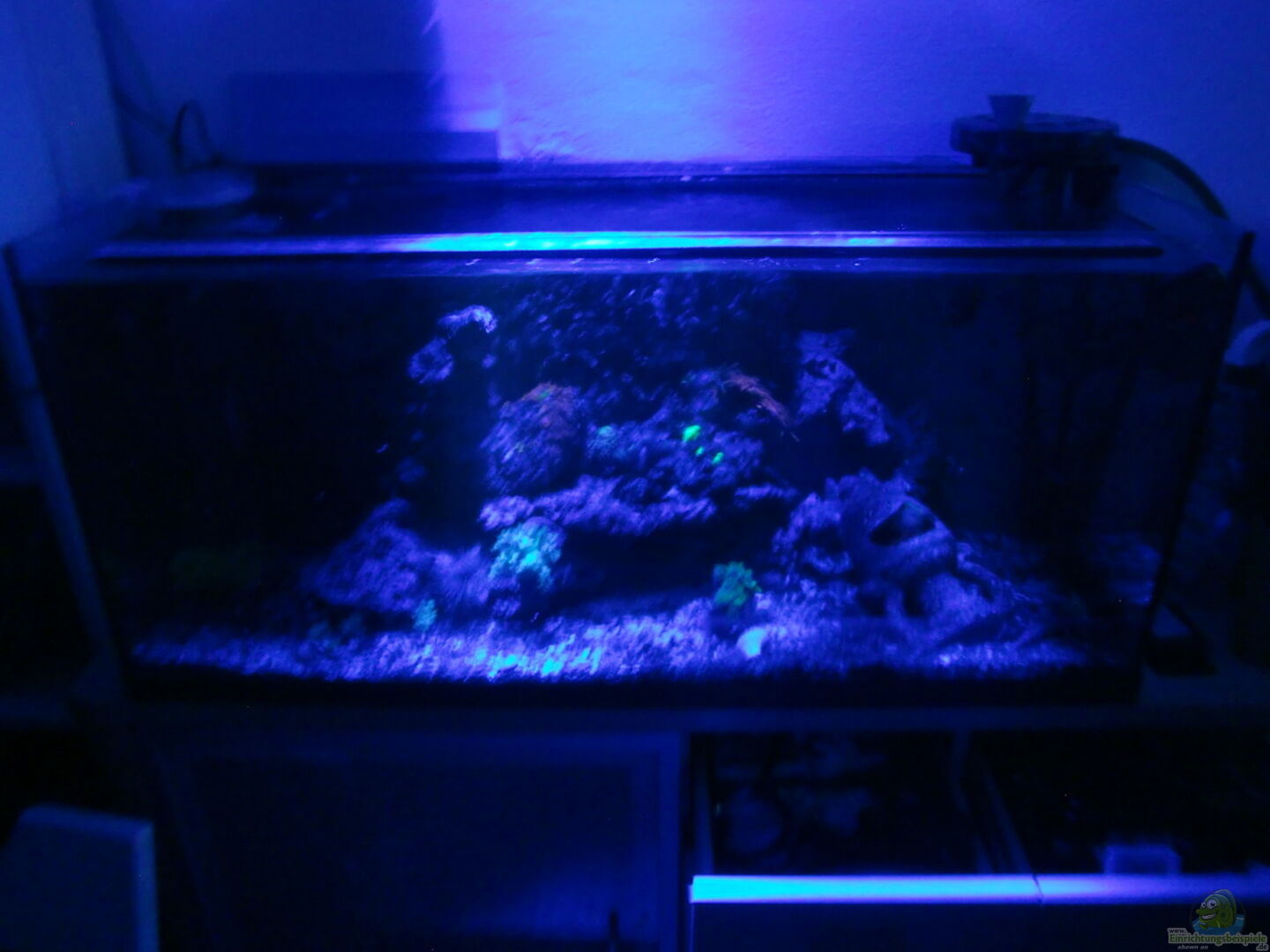 Filterbecken mit abfluss verbunden (wird umgebaut das der Abfluss zum teich geht) An der Aussenwand oben einen Abluftventilator angebracht und unten zuluftlöcher. In der Filterkammer ist Caulerpa taxifolia - Grünalge und wird wenn das Licht im Haupttank aus geht Beleuchtet (1x Aqua-Medic aquasunspot 12 W LED Spot) bis oben im Haupttank wieder das Licht angeht.