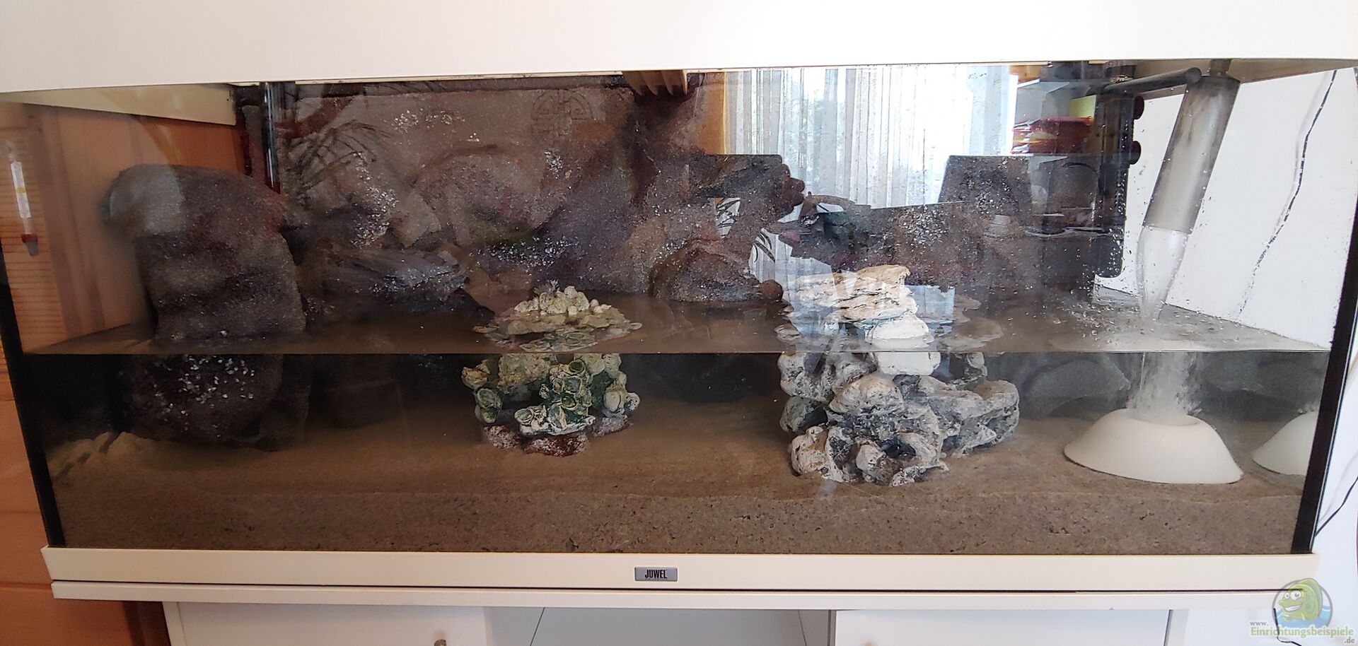 Selbst gebaute 3D-Rückwand: - Styropor (5 cm dick) mit Brunnenschaum verklebt und Höhlen heraus geschnitten - mit 2 Schichten Wei??zement bestrichen - mit 2 Schichten Epoxyharz bestrichen - mit Sand mattiert
