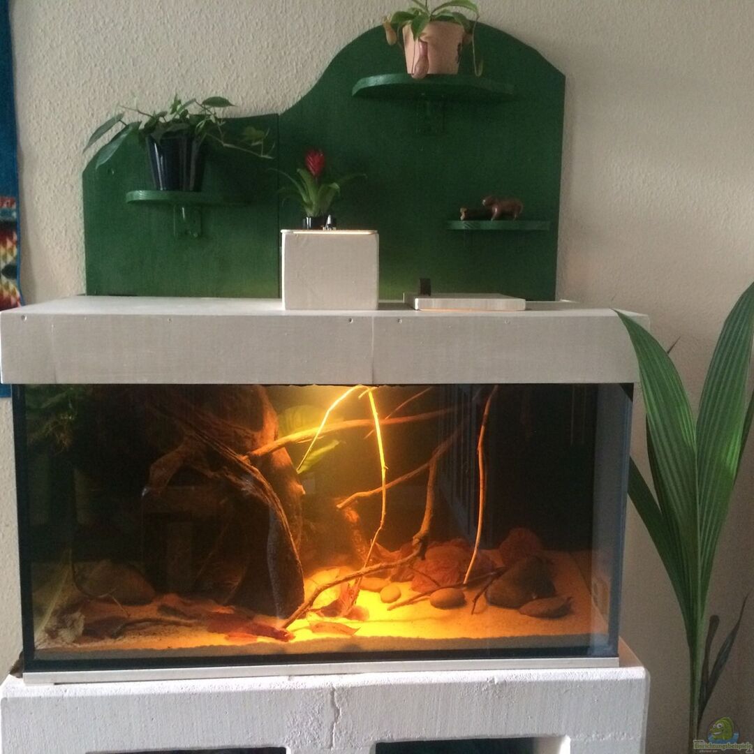 keine besonderen Ma??e o.ä.......es ist ein gebrauchtes Becken gewesen....Der Unterbau ist aus Gasbeton selbst gebaut und hat das Relief eines Gürteltieres an der Seite .....die Rückwand (au??erhalb des Beckens) ist auch Marke Eigenbau....aus Holz mit einigen Abstell-Ebenen für Pflanzen.....Hinter dem Becken ist schwarzer Bastelkarton angebracht...