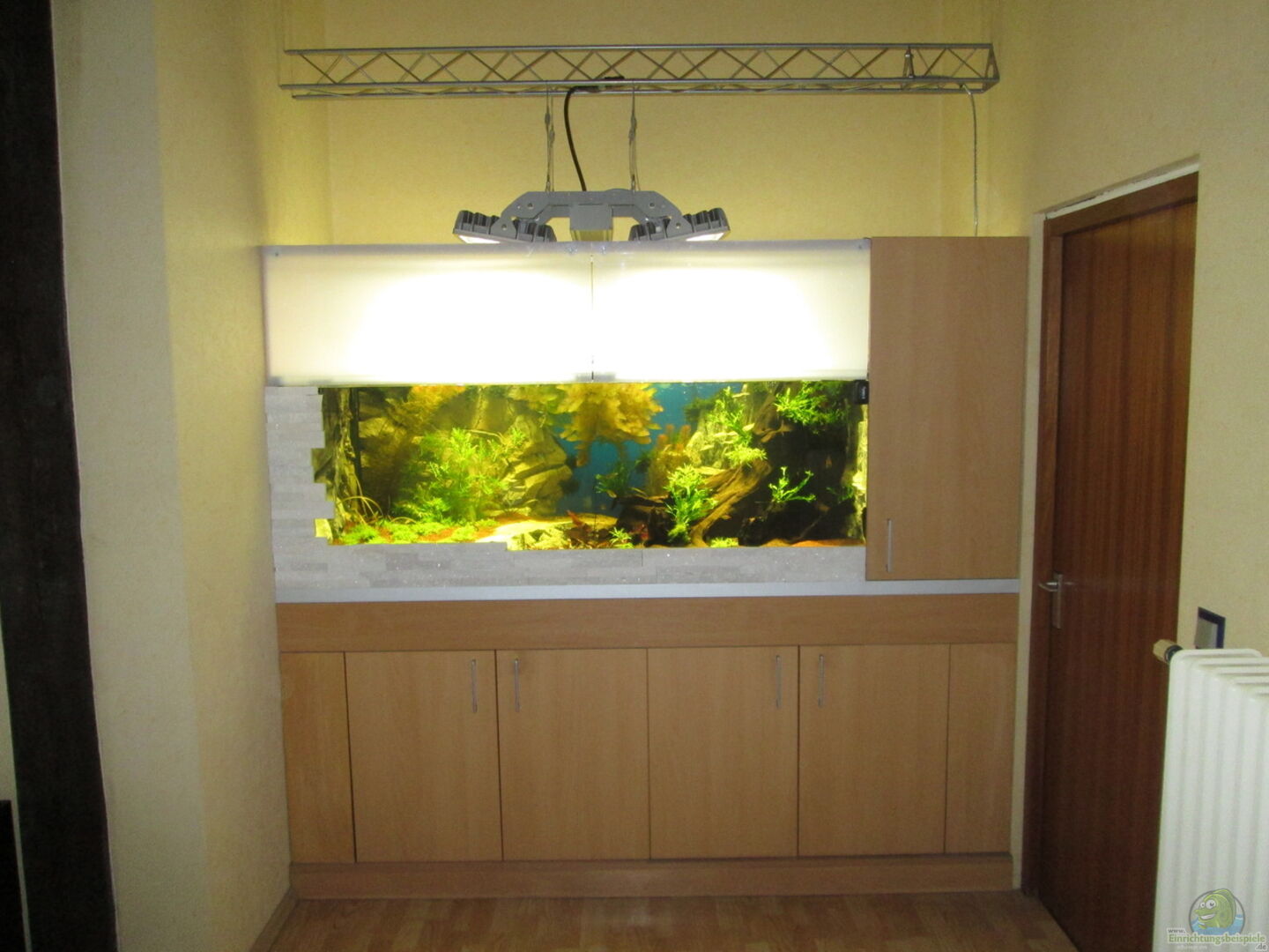 Anfertigung der Fa. der Aquarienbauer aus Hassloch. Sicherheitsstreifen am Boden und in den Ecken. Das Untergestell aus Bauteilen für Kabelbühnen ist teilweise mit der Wand verschraubt und steht zur besseren Gewichtsverteilung, auf Vierkanthölzern 100x100mm
