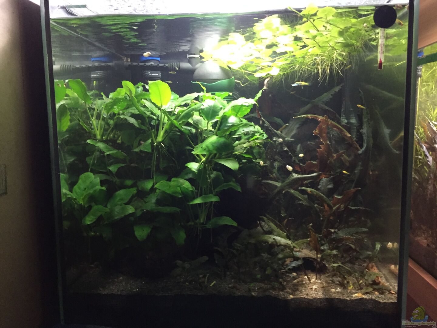 Es handelt sich um ein Standardaquarium ohne Besonderheiten. Die Abdeckung besteht aus einer Plexiglasplatte, die im Zweifel einen Fluchtversuch der Frösche aufhalten soll. Ursprünglich war dies mein Quarantänebecken und die ersten Bewohner, die in Quarantäne gekommen sind, sind sogleich drin geblieben :-D ... also ade Quarantänebecken