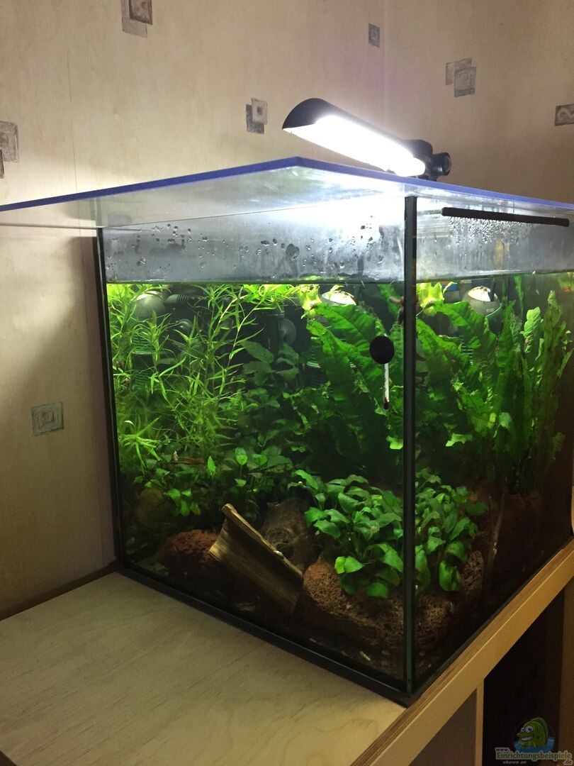Es handelt sich um ein Standardaquarium ohne Besonderheiten. Die Abdeckung besteht aus einer Plexiglasplatte, die im Zweifel einen Fluchtversuch der Frösche aufhalten soll. Ursprünglich war dies mein Quarantänebecken und die ersten Bewohner, die in Quarantäne gekommen sind, sind sogleich drin geblieben :-D ... also ade Quarantänebecken