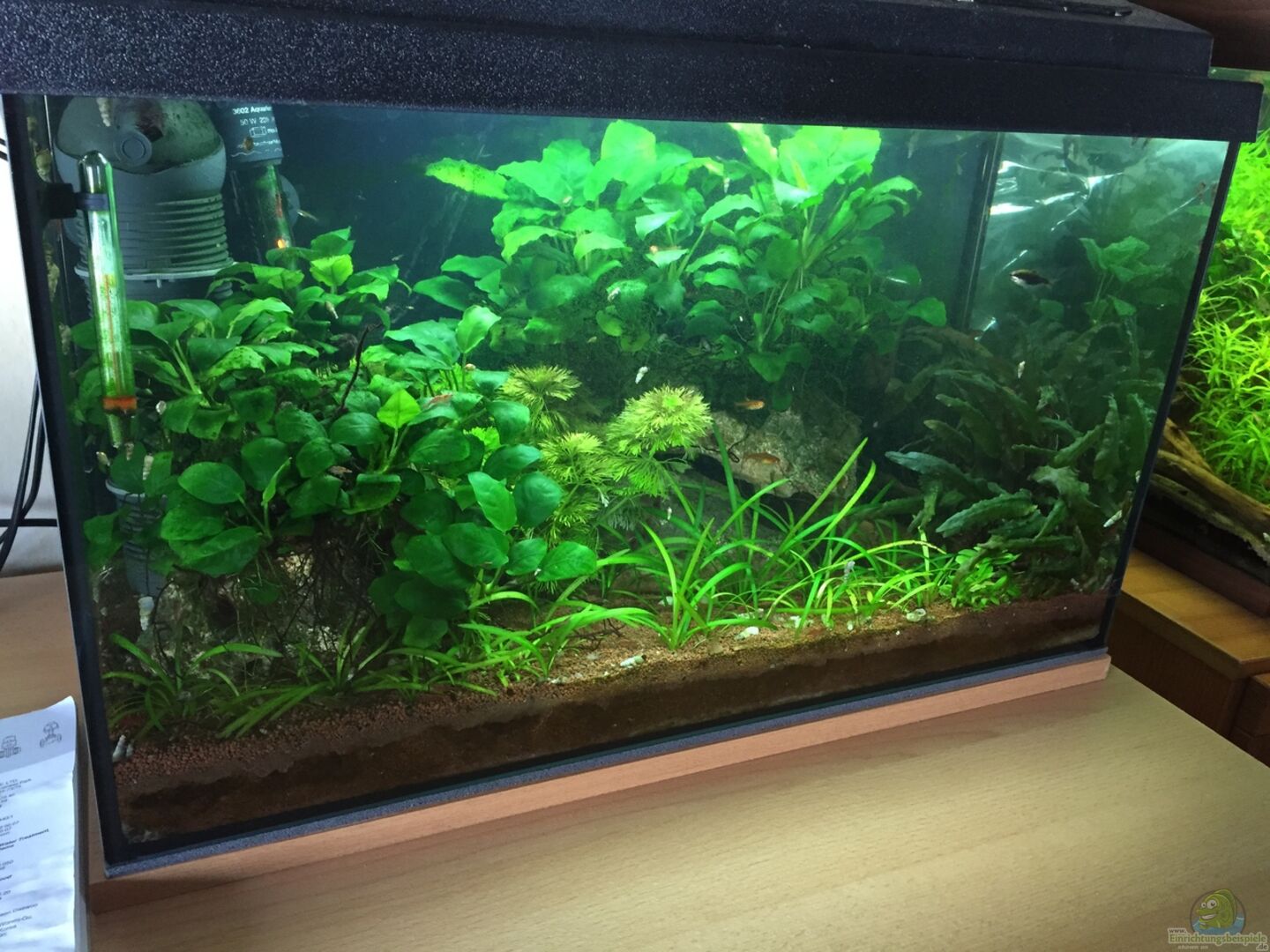 Es handelt sich um ein Standardaquarium mit den Ma??en 80x35x50 cm. Die Rückwand ist mit einer schwarzen Folie beklebt. Abgedeckt ist das Aquarium mit einer Plexiglasscheibe.