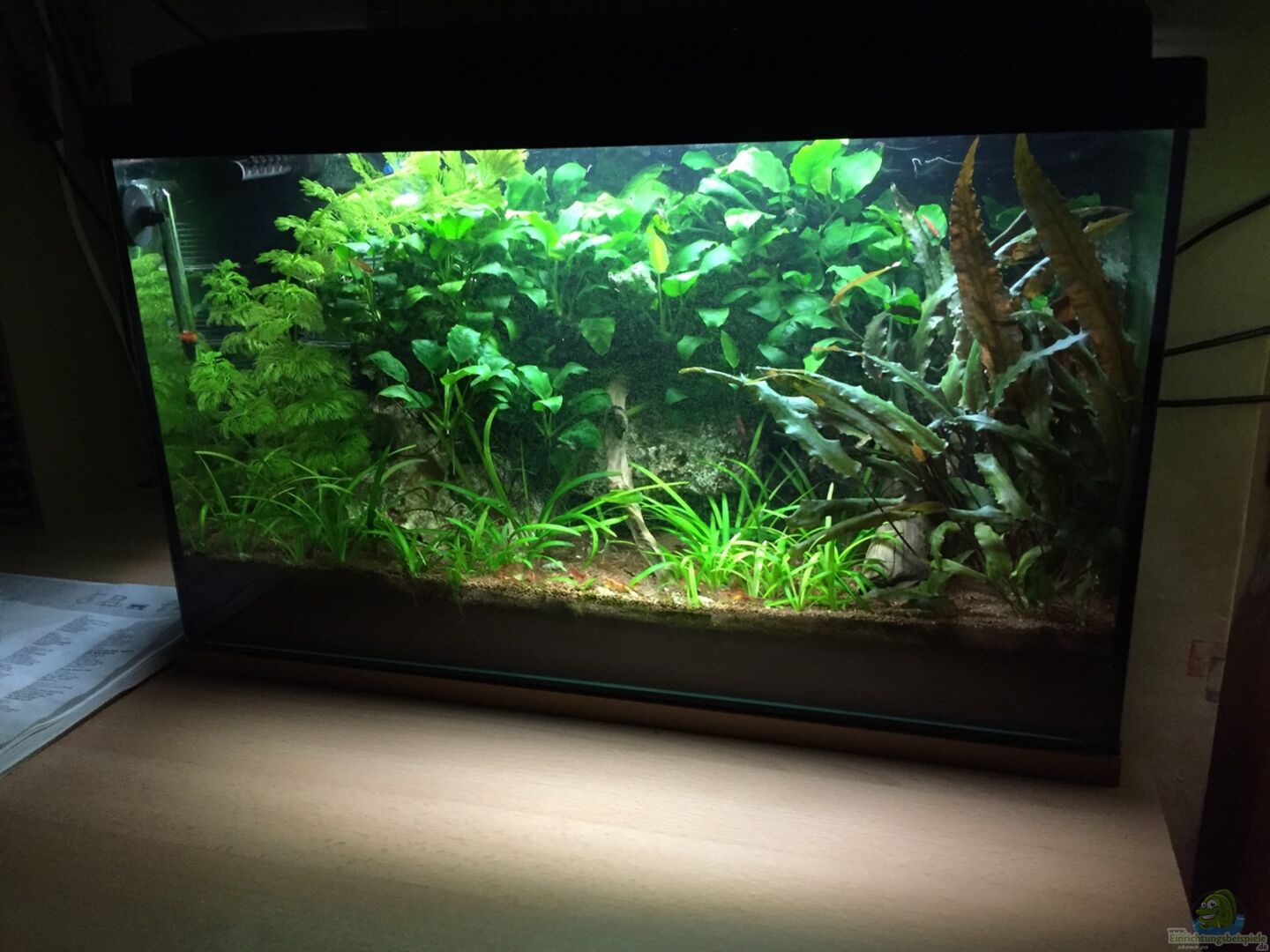 Es handelt sich um ein Standardaquarium mit den Ma??en 80x35x50 cm. Die Rückwand ist mit einer schwarzen Folie beklebt. Abgedeckt ist das Aquarium mit einer Plexiglasscheibe.