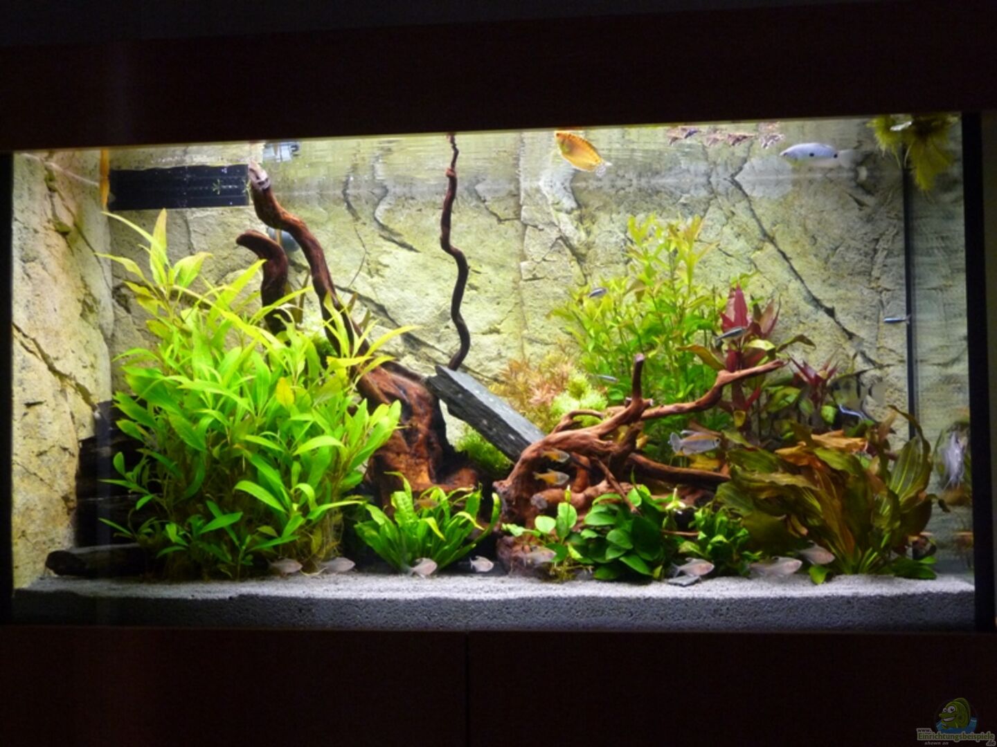 Aquarium von Firma Aquarium West gebaut. 2 Bohrungen im Boden mit ablaufschacht (Technikraum) Rückwand Slim line Steingrau