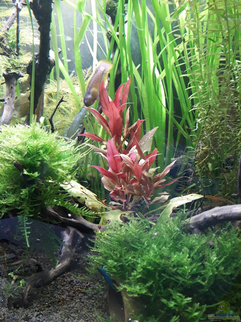 Rechts im Hintergrund wiegen sich Riesenvalisnerien in der sanften Strömung, die sich sanft über die Oberfläche legen und das Becken dort schön schummrig wirken lassen. Javafarn scheint aus einer zentral platzierten Wurzel zu spriessen. Daneben dienen zwei Cryptocoryne wendtii brown auch mal als grossblättrige Pflanze zum ausruhen oder als Schneckenrutsche. Aufgebunden auf den Wurzelspitzen finden sich Weepingmoos, Bucephalandra(Wavy Leaf) und Anubias barteri nanaPangolino. Links im Hintergrund [...]