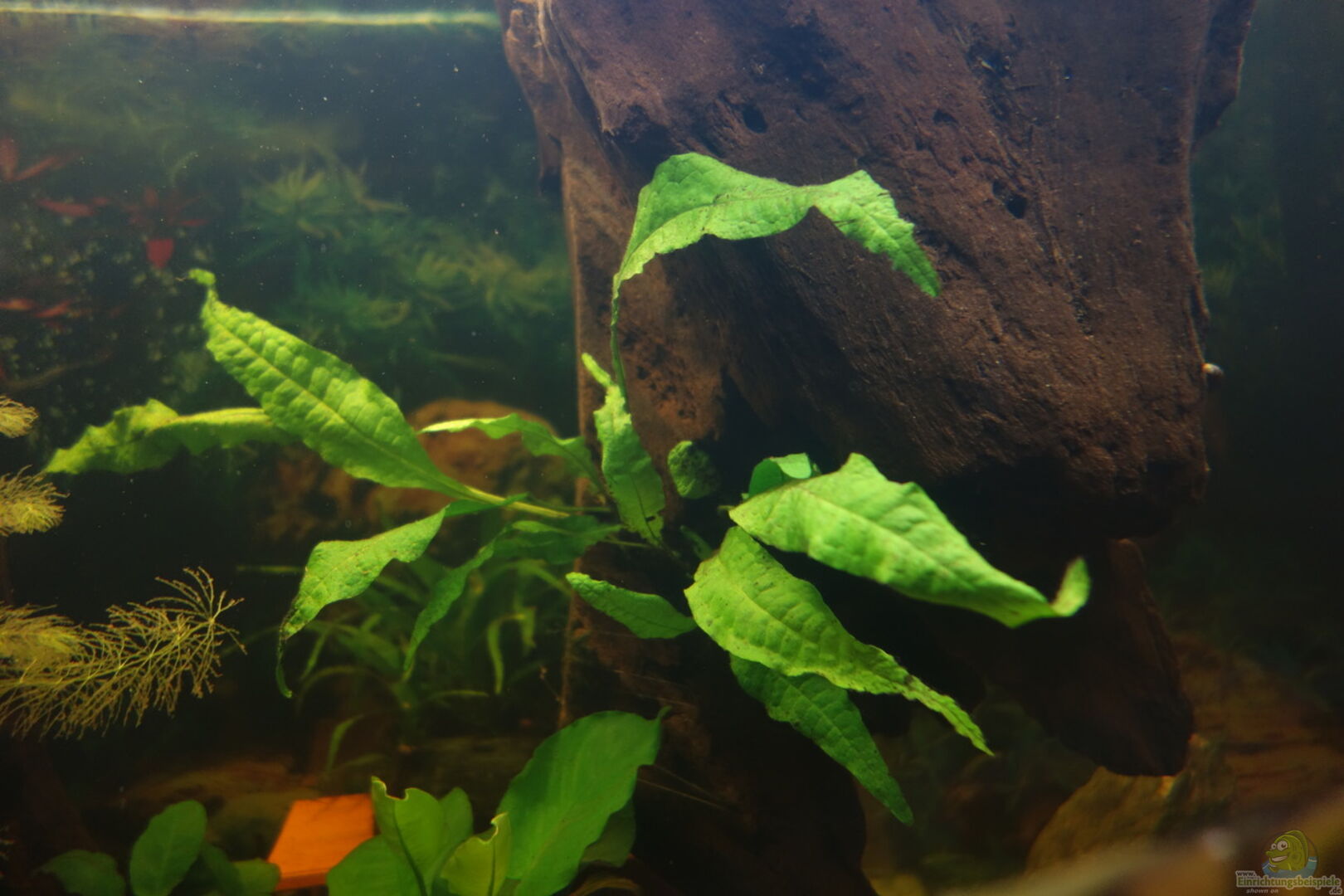 Begonnen hab ich in dem Becken mit verschiedensten Arten. Durch natürliche Selektion reduziert sich die Bepflanzung auf einige wenige verschiedene Arten, die mit den Bedingungen in meinem Becken zurechtkommen. Durch die moderate Beleuchtung und den Sandboden im Becken wachsen aktuell: Verschiedene Anubia Arten, Javamoos und noch eine andere Moosart, 2 Farn Arten, Roter Tiger Lotus, Hornblatt, Grüner Wendtscher Wasserkelch (Cryptocoryne wendtii), Mooskugeln.