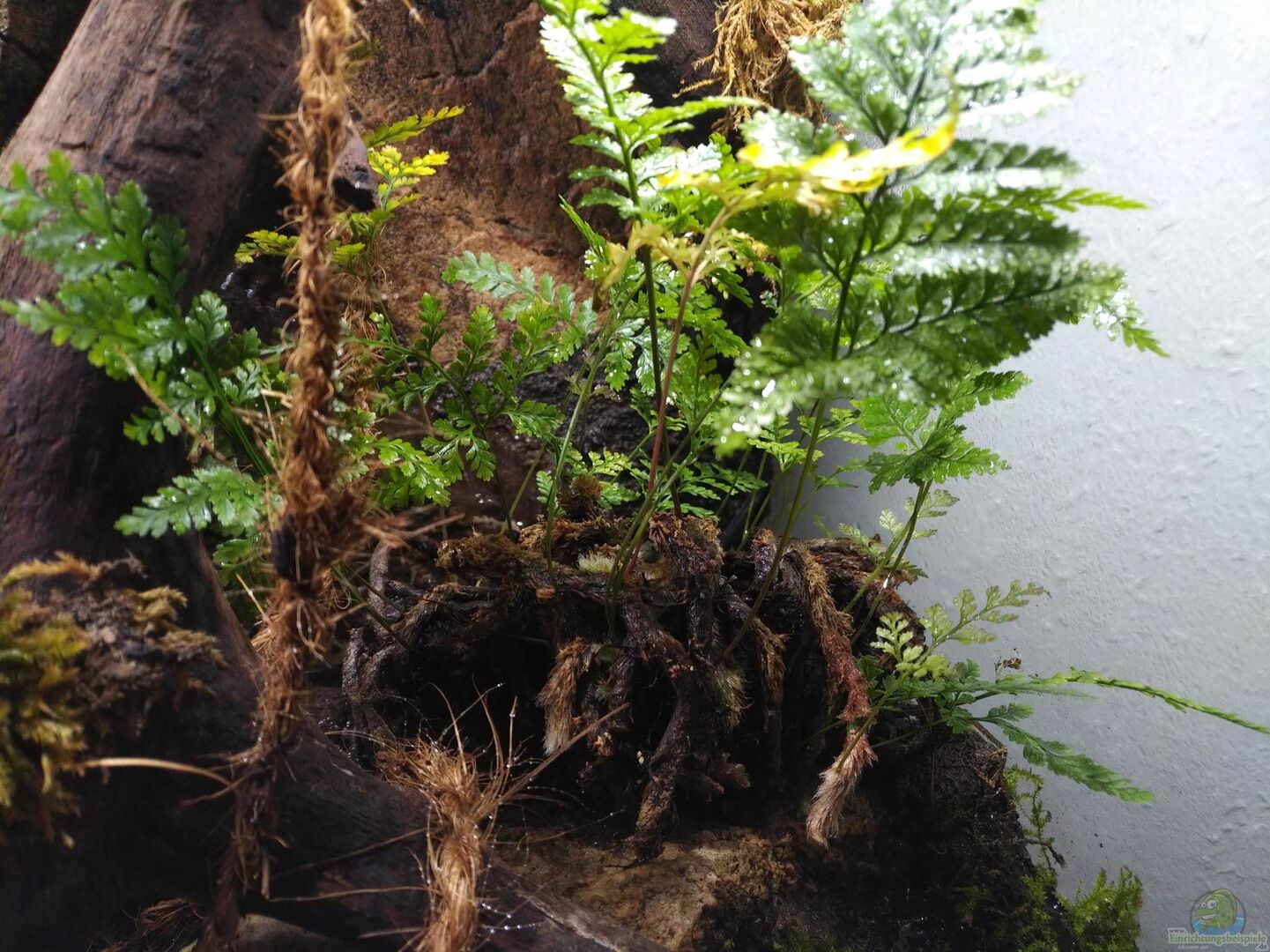 Ein Farn wie er auch beim spazieren gehen im Wald gefunden werden könnte. Ein paar Muschelblumen (Pistia stratiotes) verdunkeln den Wasserteil Cryptocoryne auf dem Landteil Noch etwas Moos an ein paar Stellen