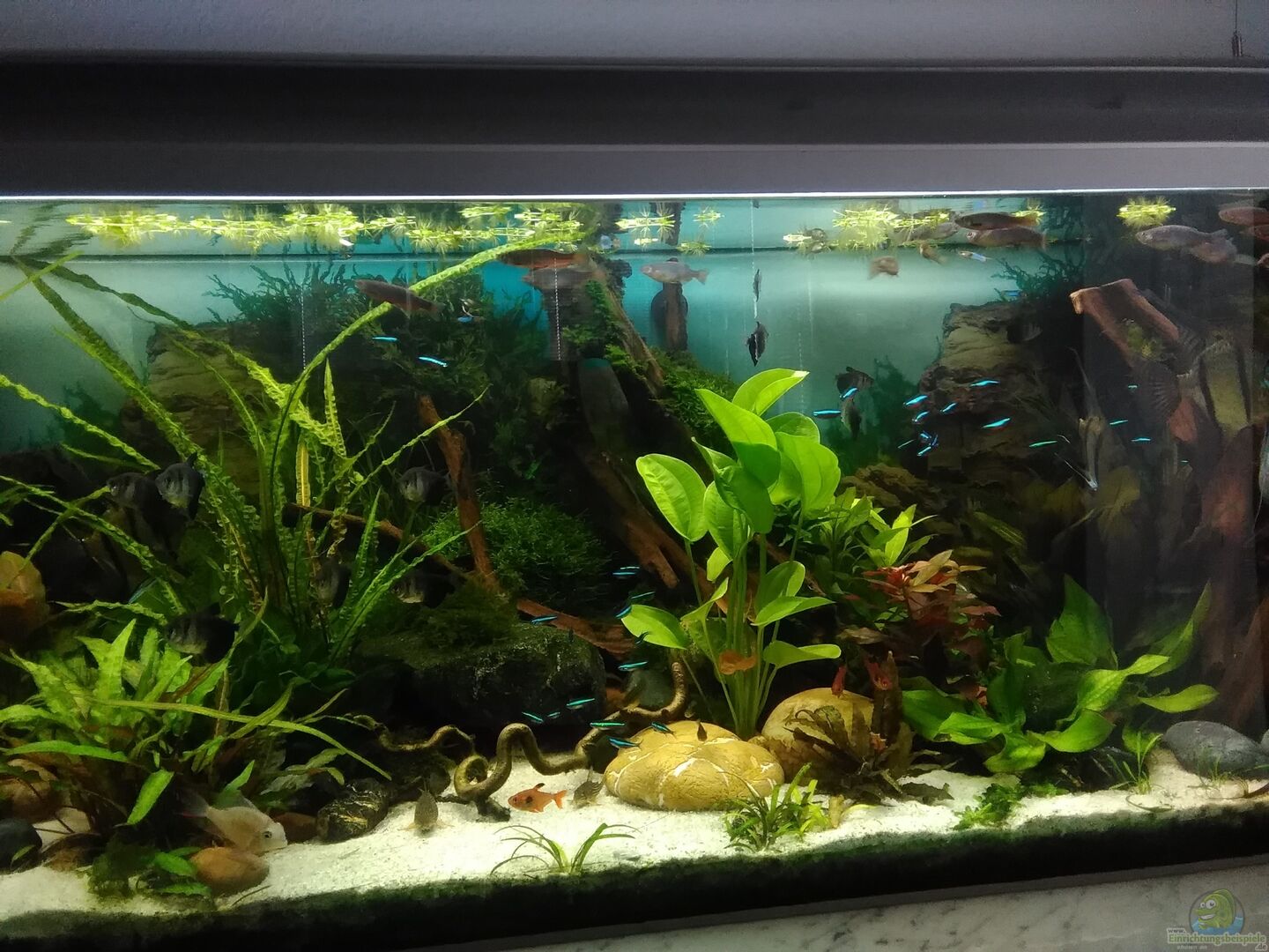 Juwel-Becken, 8 mm Float-Glas, Bodenscheibe 10 cmm Verkleidet von uns mit L-Aluschienen zur besseren Optik auf selbst gezimmertem Tisch, Filter stehen rechts und links