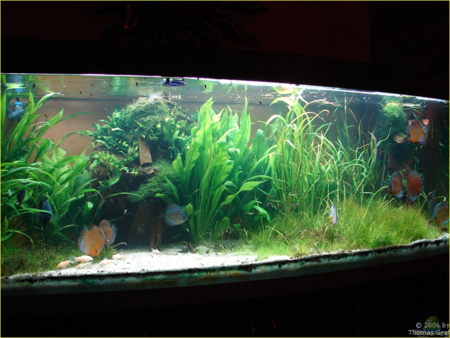 Das Becken ist eine Aquarienkombination mit einer gewölbten Frontscheibe, Unterschrank und Abdeckung im Farbton französisch Nussbaum. Der Unterschrank hat zwei Edelstahlsäulen und die Kiesblende ist ebenfalls in Edelstahllook. Das Aquarium hat zwei Lochbohrungen im Boden sowie eine Ausparrung im Unterschrank um mit den Leitungen in den Keller zu gelangen. Ersteinrichtung fand im August 2005 statt.
