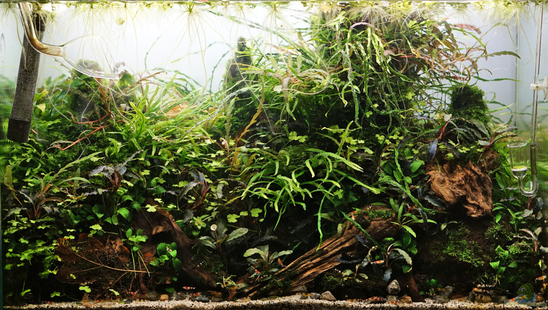 Es handelt sich um ein transparent verklebtes Glasgarten-Aquarium aus einfachem Floatglas, welches ich schon seit einigen Jahren habe. Neu ist der Unterschrank im ADA-Stil, den ich aus 19 mm MDF Platten gebaut habe.