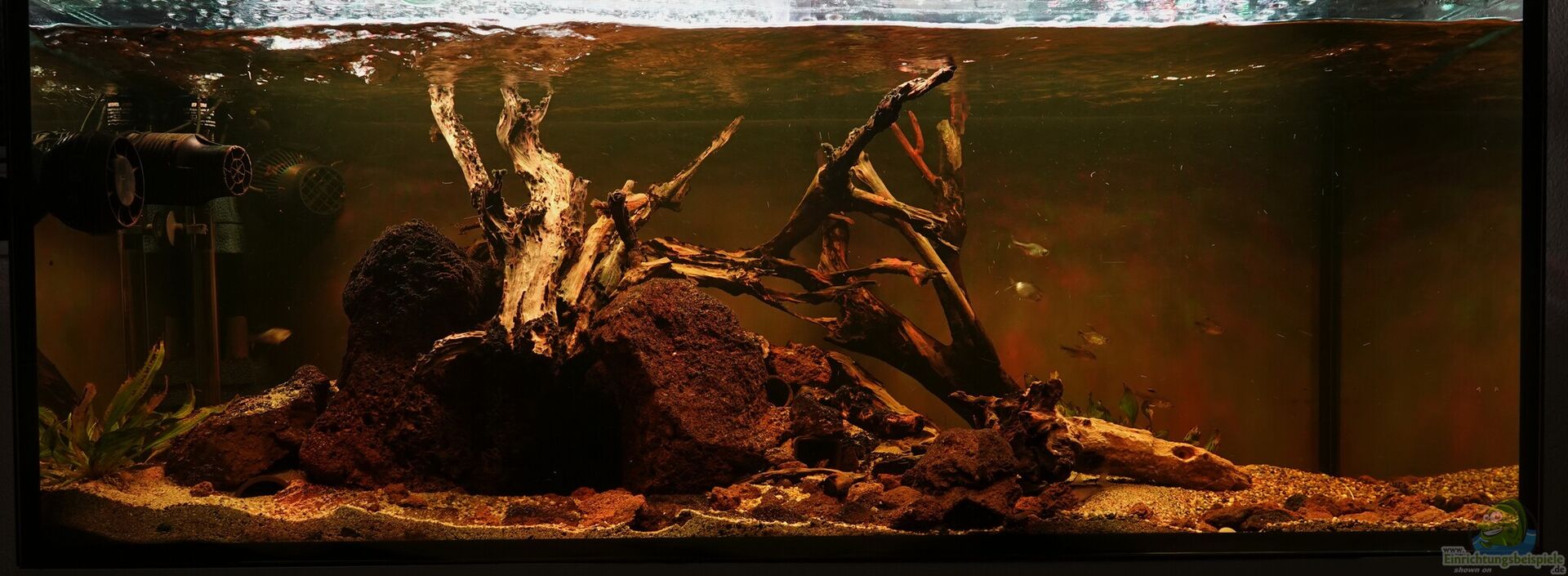 Das Aquarium soll ein Fluss/Bach-Abschnitt nachbilden. Dazu habe ich Strömungspumpen eingebaut welche ca. 15'000 Liter Wasser die Stunde bewegen. Der Besatz besteht nur aus Arten, welche der Strömung gerecht werden und diese brauchen.