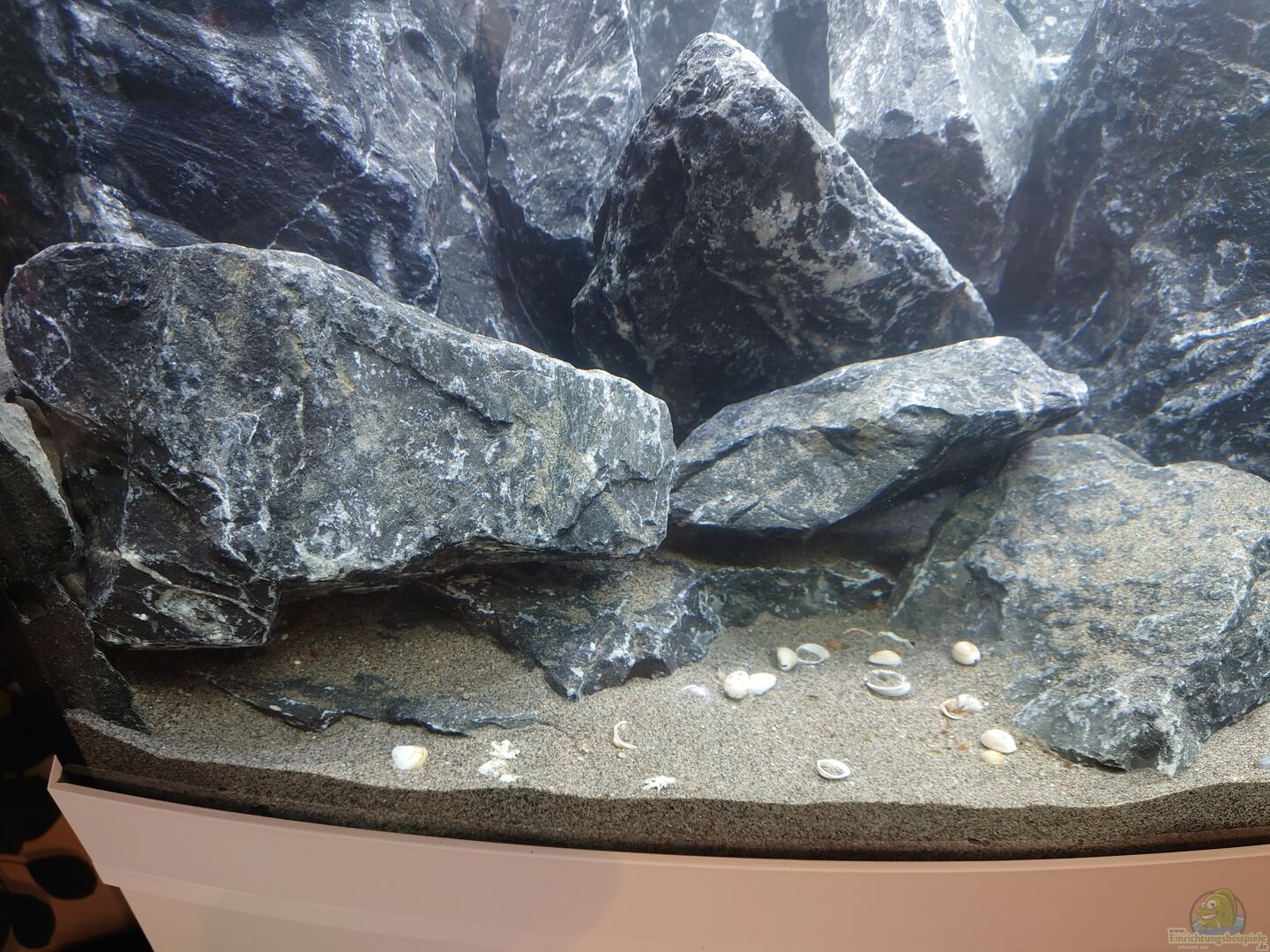 Geschätzt ca. 200 Kg Alpenkalkstein in verschiedenen Grö??en auf einer 4mm Plexiglas Scheibe. Die grö??eren Steine haben dabei locker 30 Kg auf die Waage gebracht. Rückwand und die linke Seitenscheibe sind mit Stone Granite Rückwandmodulen von Juwel verkleidet. Der Innenfilter wurde ebenfalls mit Stone Granite Modulen von der Firma Juwel verkleidet.