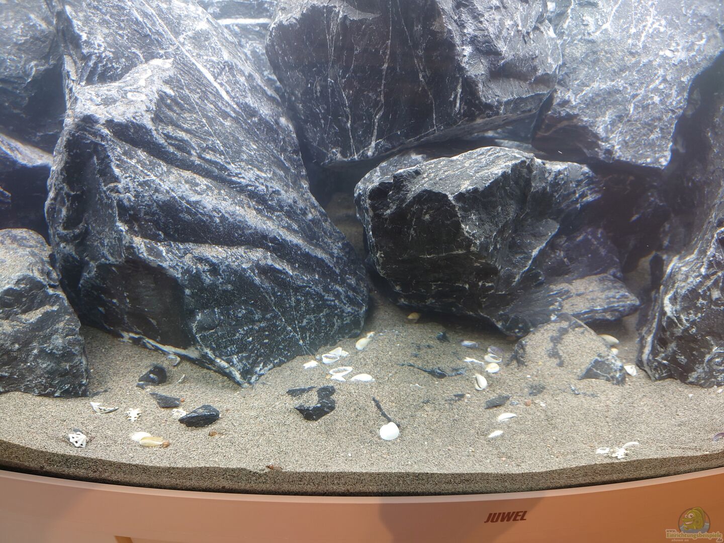 Geschätzt ca. 200 Kg Alpenkalkstein in verschiedenen Grö??en auf einer 4mm Plexiglas Scheibe. Die grö??eren Steine haben dabei locker 30 Kg auf die Waage gebracht. Rückwand und die linke Seitenscheibe sind mit Stone Granite Rückwandmodulen von Juwel verkleidet. Der Innenfilter wurde ebenfalls mit Stone Granite Modulen von der Firma Juwel verkleidet.
