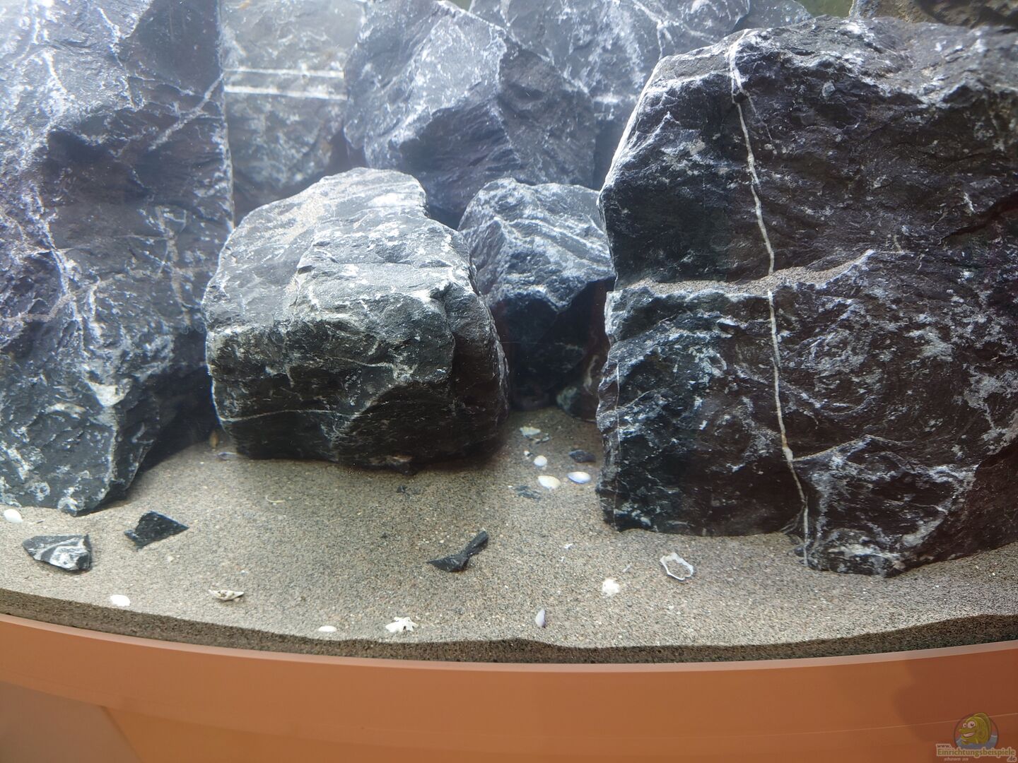 Geschätzt ca. 200 Kg Alpenkalkstein in verschiedenen Grö??en auf einer 4mm Plexiglas Scheibe. Die grö??eren Steine haben dabei locker 30 Kg auf die Waage gebracht. Rückwand und die linke Seitenscheibe sind mit Stone Granite Rückwandmodulen von Juwel verkleidet. Der Innenfilter wurde ebenfalls mit Stone Granite Modulen von der Firma Juwel verkleidet.