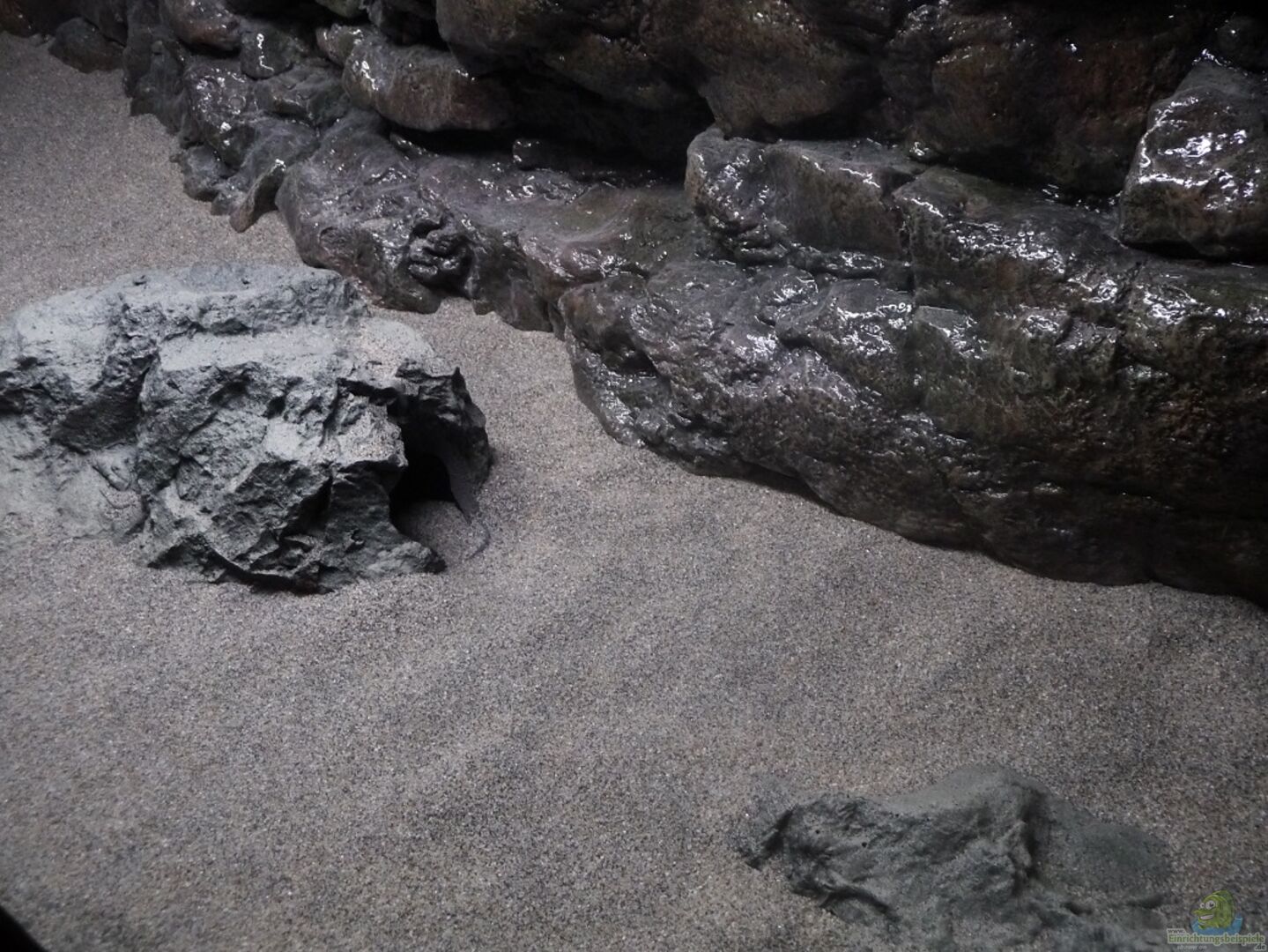 3D- Rückwand: Vom Aquarienbauer wurde mir eine Rock Zolid 3D- Rückwand im Design Komodo eingebaut. Diese Rückwände werden hochwertig hergestellt mit sehr schönen 3D-Effekten. Die Silikonnähte wurden passend zur Rückwand mit Kies beschichtet. Im Bereich der Rückwand wurde die rechte Kopfseite des Beckens mit schwarzen Silikon verdeckt um nicht hinter die Rückwand zu sehen. <><><><><><><><><><><><><><><><><><><><><><><> [...]