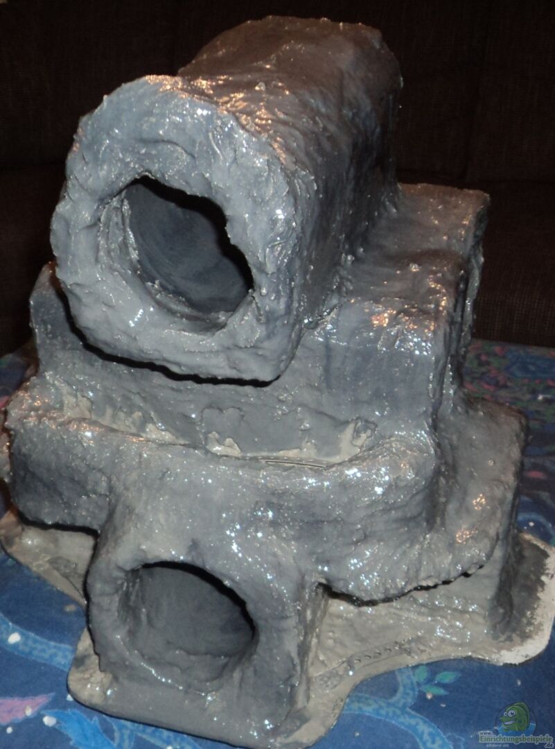 Erst mal zu dem Felsen. Der Felsen ist aus 5 Tonröhren gebaut und steht auf einer 1, 5 cm dicken Plexiglasplatte. Die Ma??e sind b. ca. 40 cm x 40 cm, h. ca. 45 cm. Der Felsen ist mit Aquariumsilikon zusammen geklebt, dann mit Fliesenkleber überzogen. Für die Befestigung der Pflanzen habe ich Edelstahlband mit eingearbeitet wo denn die Pflanzen mit Angelschur festgebunden werden. Der Felsen ist dann mit 3 Schichten Epoxidharz versiegelt. In der Reinfolge hellgrau ??? dunkelgrau & schwarz. [...]