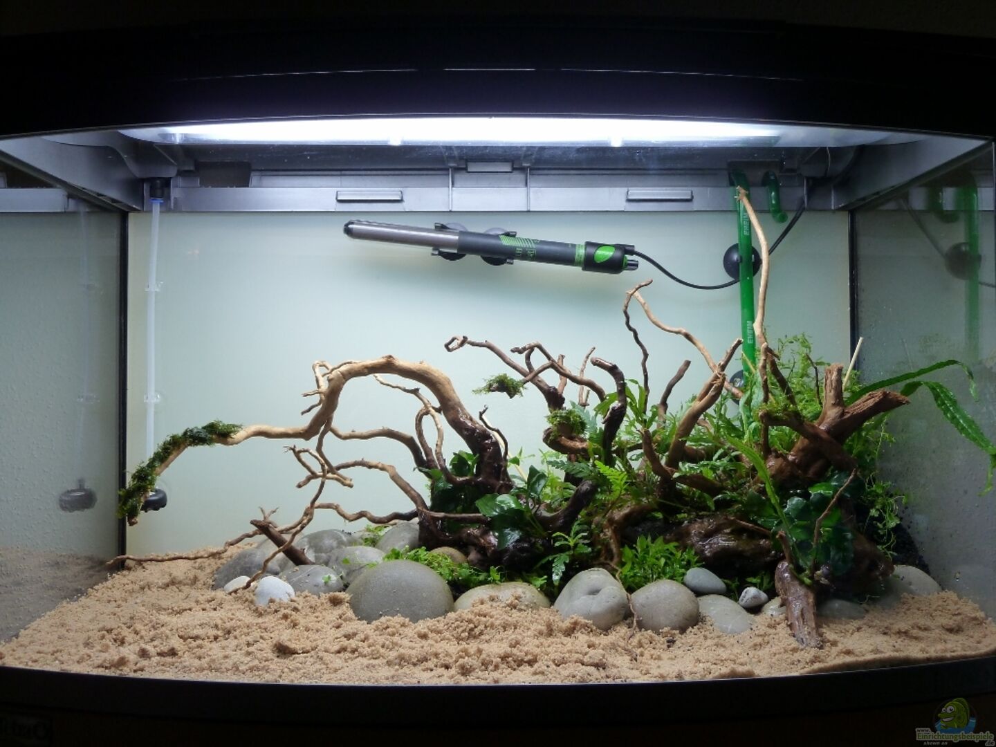 Becken hat eine gebogene Frontscheibe. Aufgrund dessen hat es lediglich 100 Liter. Hintere Scheibe wurde mit Milchglasfolie beklebt. DIY Hintergrundbeleuchtung mit Sonnenauf- und Sonnenuntergang.