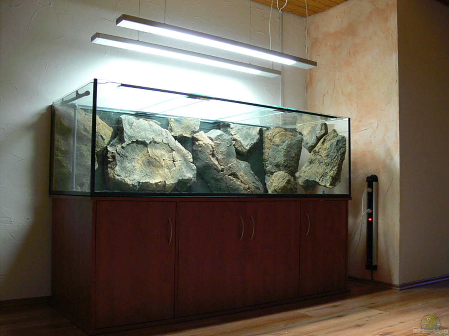 ca. 200 kg Solnhofer Gestein, kommen hier nur in unserer Region vor. Diese habe ich im Becken so angeordnet, das sich viele Spalten und gro??e/kleine Höhlen ergeben haben. So können sich die Tiere ihre Reviere abstecken und sich auch mal aus dem Weg gehen`. Auch der direkte Blickkontakt kann so vermieden werden. Da die Steine gleichzeitig aufgebaut (wie ein Irrgarten) sind, können sie schön durchschwommen werden. Des Weiteren wurde in den Ecken auf beiden Seiten (im hinterem Teil) gro??e [...]