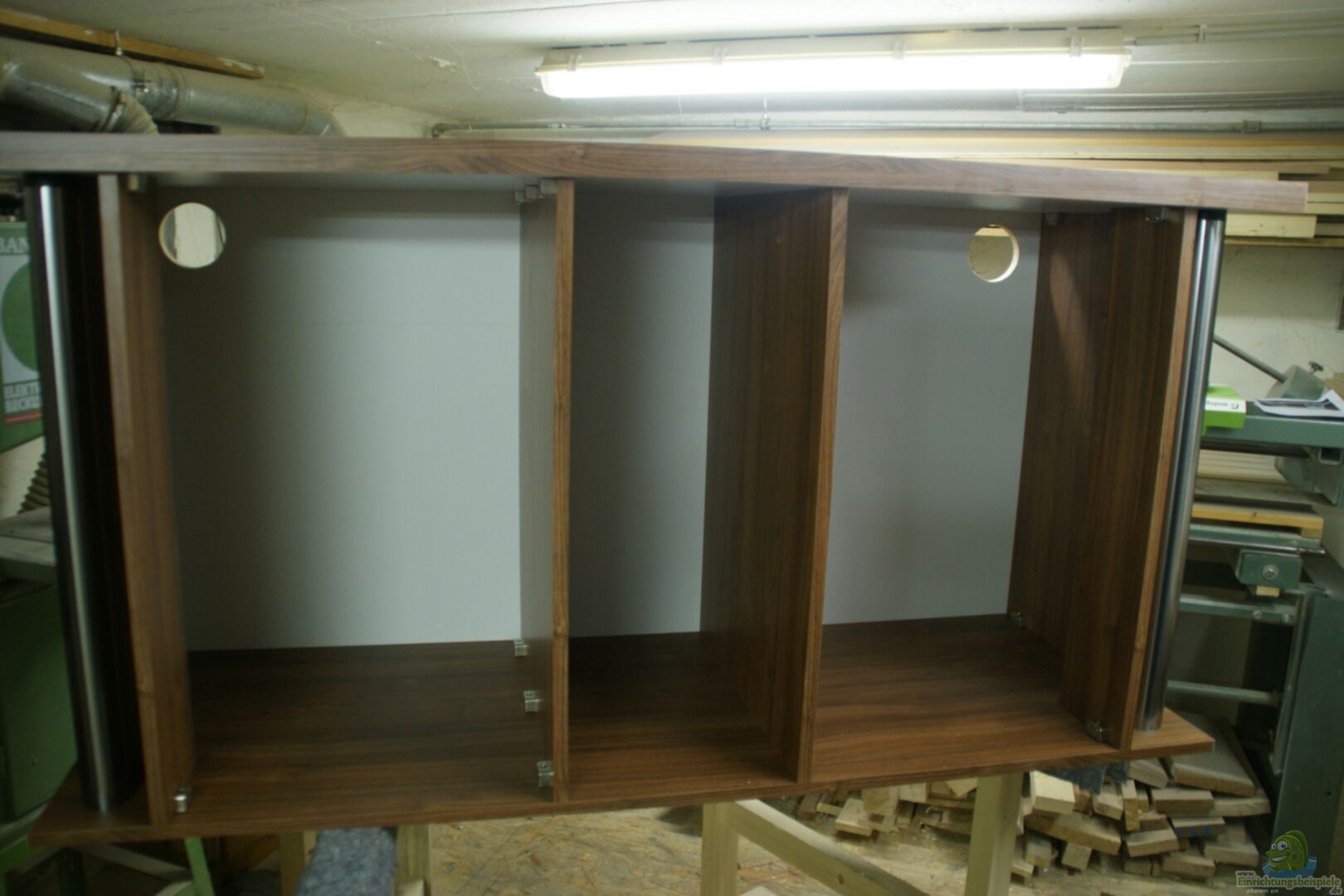 2 Bohrungen in der Rückwand damit diese Hinterschwimmbar ist und beide Ansaugrohre befinden sich dahinter. Das Aquarium selbst ist aus 12mm Glas Sto?? verklebt mit Sicherheitsnaht. Hergestellt von LTE-Aquarien in Haltern am See www.aquarienkontor.de Aquarium Schrank< der Schrank ist Eigenbau aus 22mm starken Platten, er wurde mit Trapezen verbunden so das man ihn wieder komplett zerlegen könnte. Die Deckplatte besteht aus 2x 22mm starken Platten. Also alles in allem sehr stabil. [...]