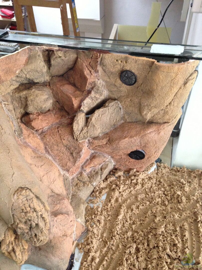 Das Becken ist nach unseren Ma??en gefertigt worden und hat einen eingebauten 4 Kammer Bio Filter. Es ist in die Wand eingelassen und steht im gleichen Raum wie die Heizungsanlage, womit wir problemlos das Becken (solargestützt) heizen können. Wasserablauf, Zulauf und Waschbecken sind direkt am Becken installiert. Als Unterbau habe ich die Wände mit Kalksandsteinen geklebt und mit einer dicken Betonplatte abgeschlossen. Der obere Teil des Aquariums ist mit drei Wie??lacktüren abgehangen. [...]