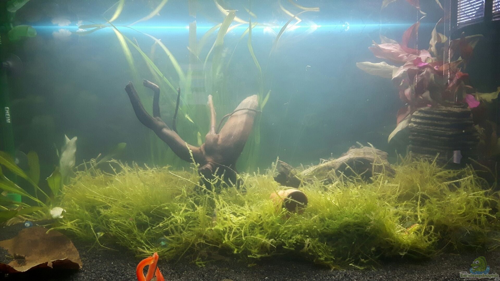 Das Becken hat eine gewölbte Frontscheibe, daher an den Seiten 30 cm, in der Mitte 38 cm tief. Der grö??te Teil des Wassers wurde aus dem alten 96 l Becken übernommen, genauso der bereits seit längerem laufende Au??enfilter sowie die Pflanzen.