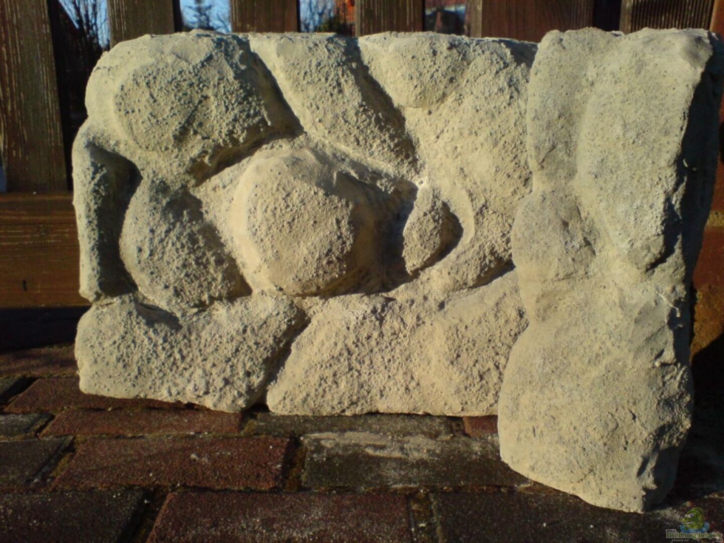 ca. 80 Schneckenhäuser (Weinbergschnecken aus dem Lebensmittelfachgeschäft) Die Betonrückwand habe ich weder farblich behandelt noch versiegelt, da auf ihr mit Sicherheit eine Menge Algen wachsen werden und Beton alkalisch ist, was den Wasserwerten nicht nur nicht schadet, sondern eher noch gut tut. Die Wand wurde auf einem Styroporträger mit Beton (1:3) modelliert und anschlie??end mit Zement sowie Sand bestreut. Das Styropor wurde ganz oder zu einem gro??en Teil geschmolzen und entfernt. [...]