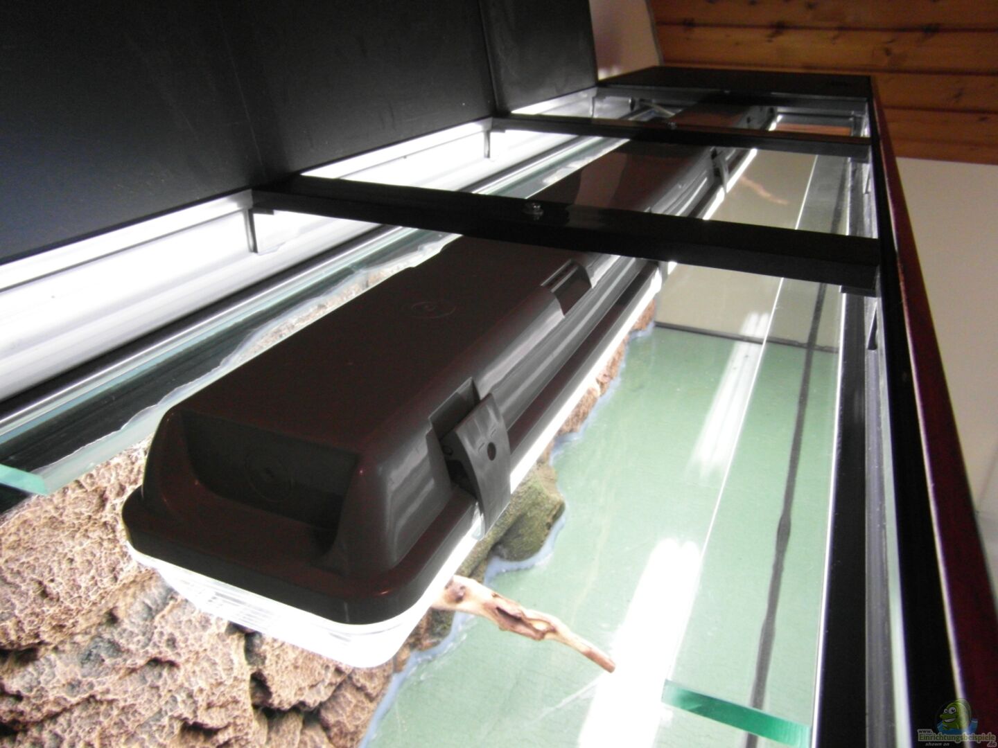 - Glasstärke 10 mm Floatglas mit schwarzem Silikon sto??verklebt - 1 Längssteg (Rückwand), der 2. (Frontseite) wurde nachträglich von mir zum besseren ???Händling??? bzw. Reinigung des Beckens entfernt. - ma??angefertigte Aquarienabdeckung passend in nussbaumfarben mit einer klassischen Baumarkt-Feuchtraumleuchte mit 2x36 Watt - Rückwandmodule von Juwel (Modell Root und Rock) - 5cm hohe aufgeklebte Sichtschutzblende für den Bodenbereich - bestehende Wohnraumkommode [...]