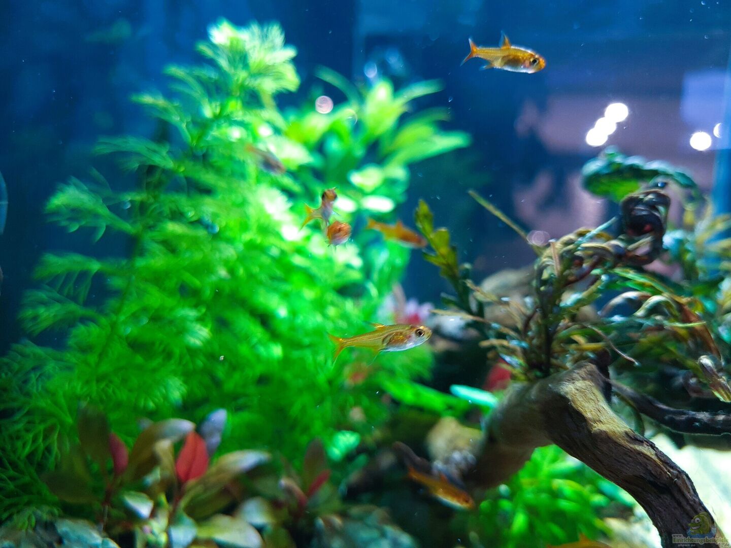 ein paar Posthornschnecken aus meinen anderen Aquarien durften zuerst einziehen um sich schonmal um die ersten Algen zu kümmern. Diese haben auch direkt damit begonnen erste Nester zu legen. Schon bald gesellten sich die ersten Neocaridina (Red Cherry und Blue Jelly) dazu. Als letztes zog ein Trupp von 12 Hyphessobrycon amandae (Feuertetra/Funkensalmler) ein und hauchten dem ganzen ordentlich Leben ein. eine weitere Farbe der Neocaridina ist eingezogen: Yellow.