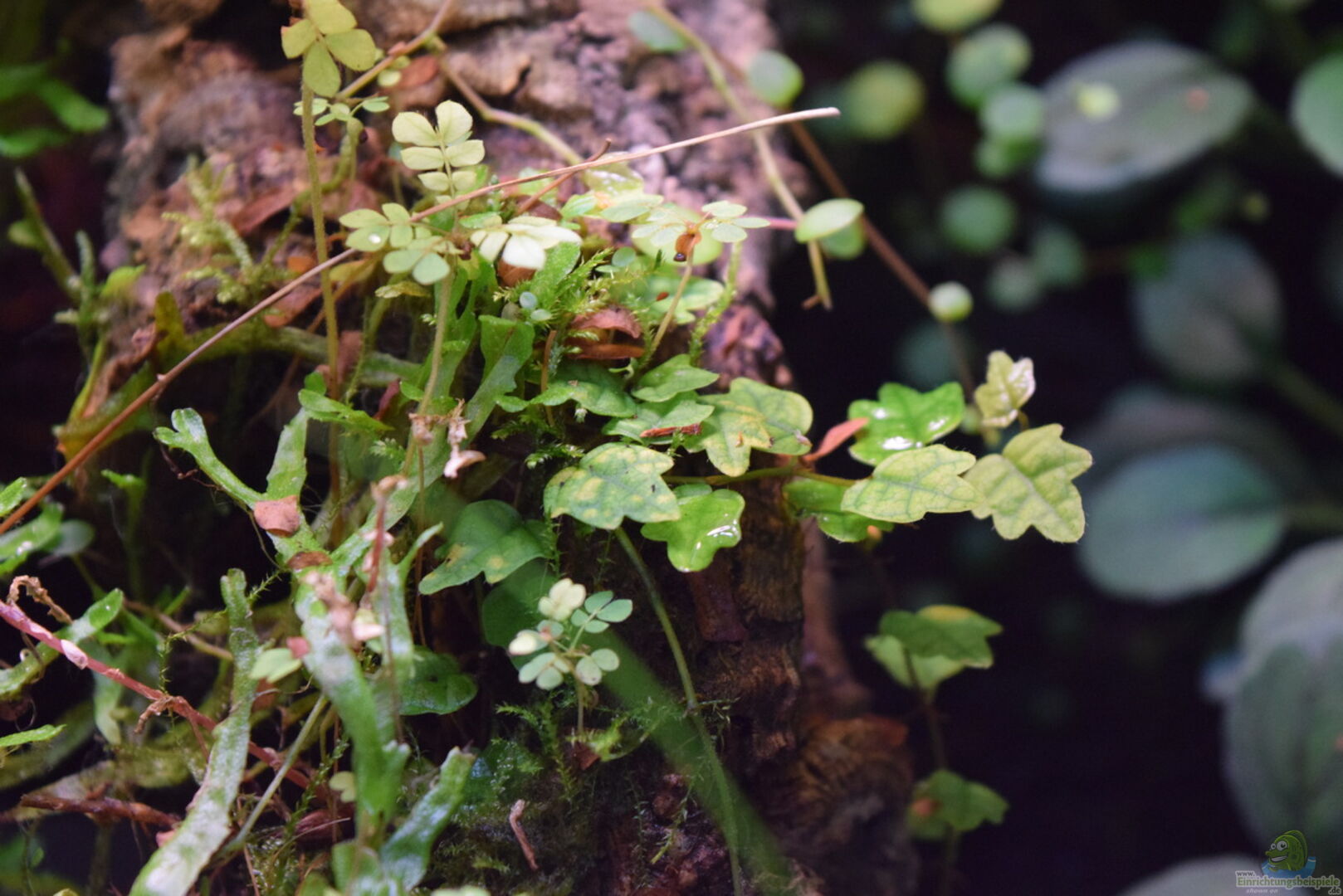 Schwimmpflanzen: Lemna minor, Limnobium laevigatum Wasserpflanzen: Ceratophyllum demersum, Echinodorus x Regine Hildebrandt, Anubias barteri Nana, Acorus gramineus Moose: Riccia fluitans, Taxiphyllum barbieri, Monosolenium tenerum Landpflanzen: Barbosella cucullata, Biophytum sensitivum, Begonia bowerae, Episcia dianthiflora, Ficus scandens, Neoregelia fireball, Neoregelia pauciflora, Neoregelia Red spottet, Peperomia, Ficus borneo, Selanginella spec, Ficus quercifolia