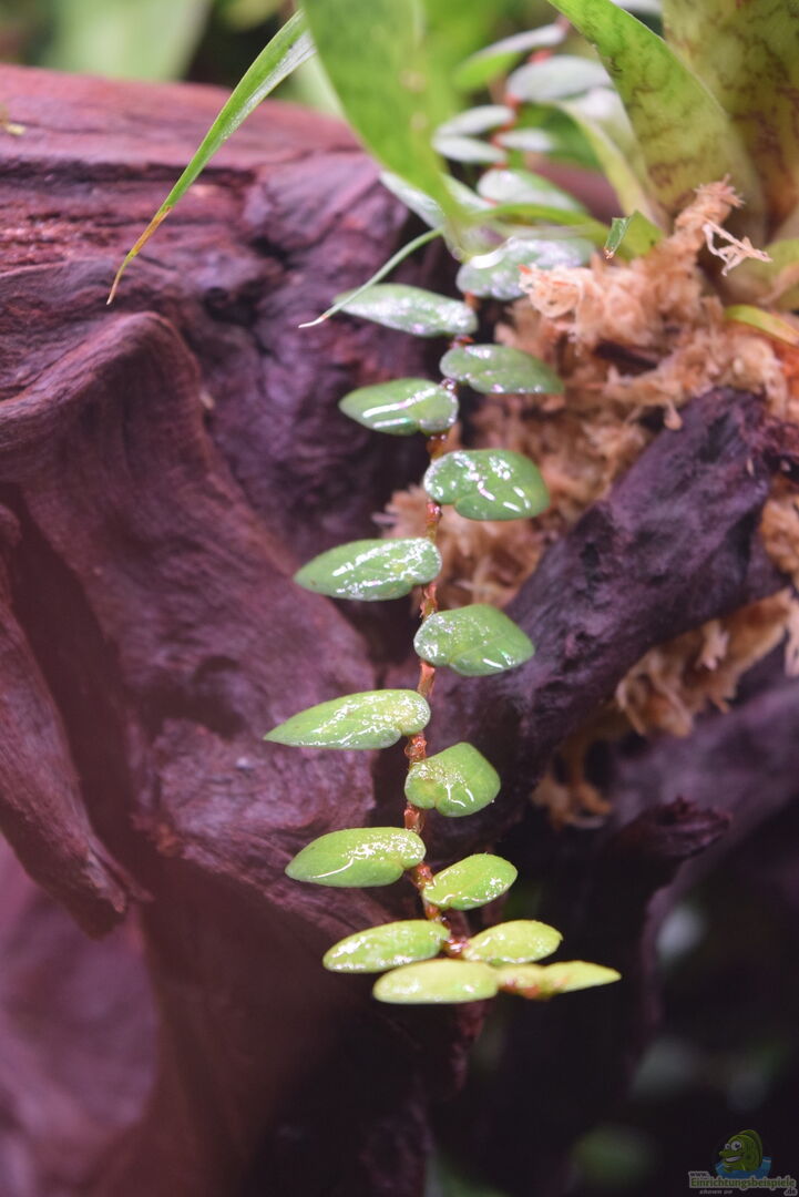Wasserteil: Submers: Taxiphyllum barbieri, Emers: Bucephalandra sp. Red, Anubias hastifolia, Hydrocotyle tripartita, Sphagnum Landteil: Bromelien: Neoregelia Akeso, Neoregelia ampullaceae Hybride, Vriesea hieroglyphica Rückwandteil: Ficus scandes quercifolia, Begonia prismatocarpa, Syngonium wendlandii, Monstera acuminata, Ficus spec. Borneo, Ficus sagittata Das Sphagnum hab ich aus einem anderen Terrarium geerntet und mit Hygrolon an der Mangrovenwurzel befestigt. [...]