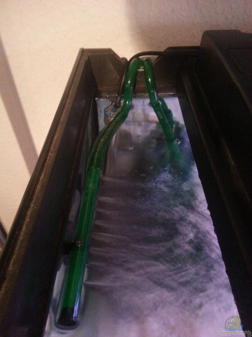 Um eine ganzheitliche Wasserumwälzung zu gewährleisten ist noch eine Strömungspumpe der Marke Eigenbau verbaut. Sie verfügt über eine Fördermenge von 700l / h und ist einstellbar. Sie läuft momentan auf voller Leistung und ist gegenüber vom Filtereinlass angebracht. Beheizt wird das Aquarium von einem 150 Watt Heizstab der Firma Jäger. Wie bereits erwähnt ist auch die Aquarienabdeckung selfmade. Hierzu habe ich die Abdeckung meines 112l Beckens mit verwendet. Über das Becken [...]