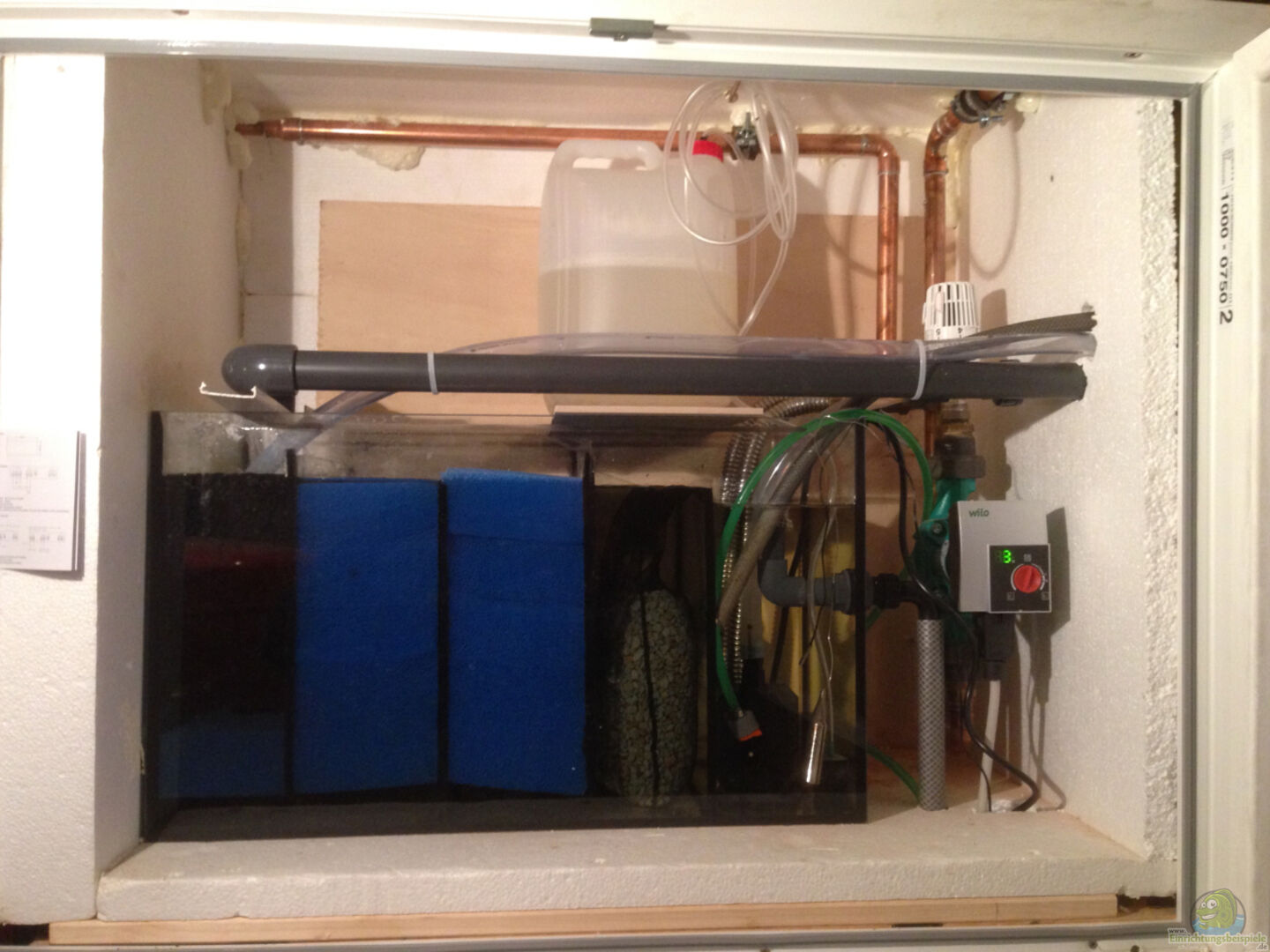 Das Aquarium wird über die Heizung des Hauses auf Temperatur gebracht. Da sich das Technikbecken im Heizungsraum befindet, hat sich diese Variante förmlich aufgezwungen. Für das Technikbecken wurde eine extra Heizungspumpe installiert, da die Pumpe der Hausheizung nicht immer in Betrieb ist. Im Technikbecken ist ein kleiner Wärmetauscher aus Edelstahl untergebracht der nach Bedarf mittels Heizungsthermostat mit Heizwasser versorgt wird. Der externe Fühler des Thermostats ist in der Klarwasserkammer [...]