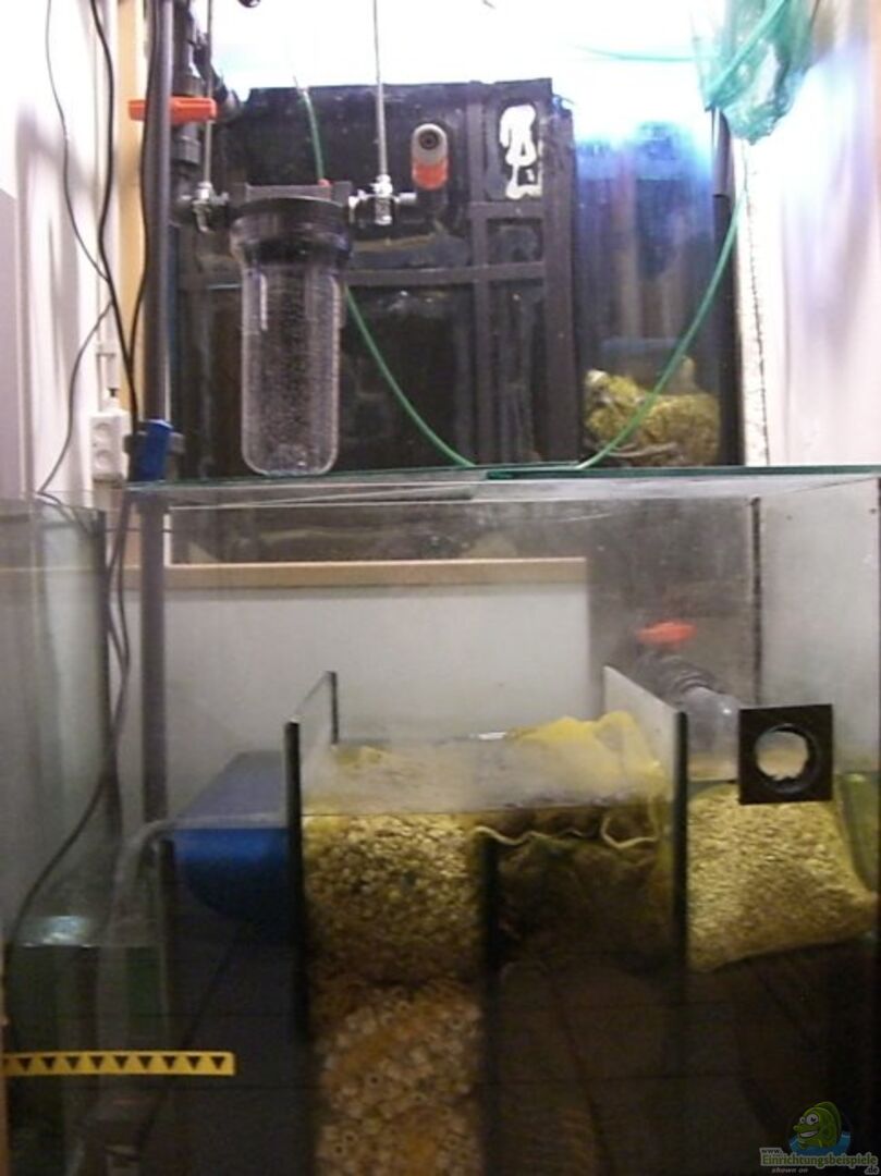 Strömungspumpe mit nachgeschalteten drei Filterpatronen (Filterschwamm) zur zusätzlichen Strömung im Aquarium. Zum Befüllen des Aquariums mit Frischwasser wird ein Carbonit Monoblockfilter mit gesinterter Aktivkohle eingesetzt. In der letzten Filterkammer befindet sich ein Titanheizer von Schego mit einer Leistung von 300 Watt, der das Aquariumwasser konstant auf 25°C hält.Geregelt wird der Heizer über die Dennerle Steuerung SOLO 400 S.