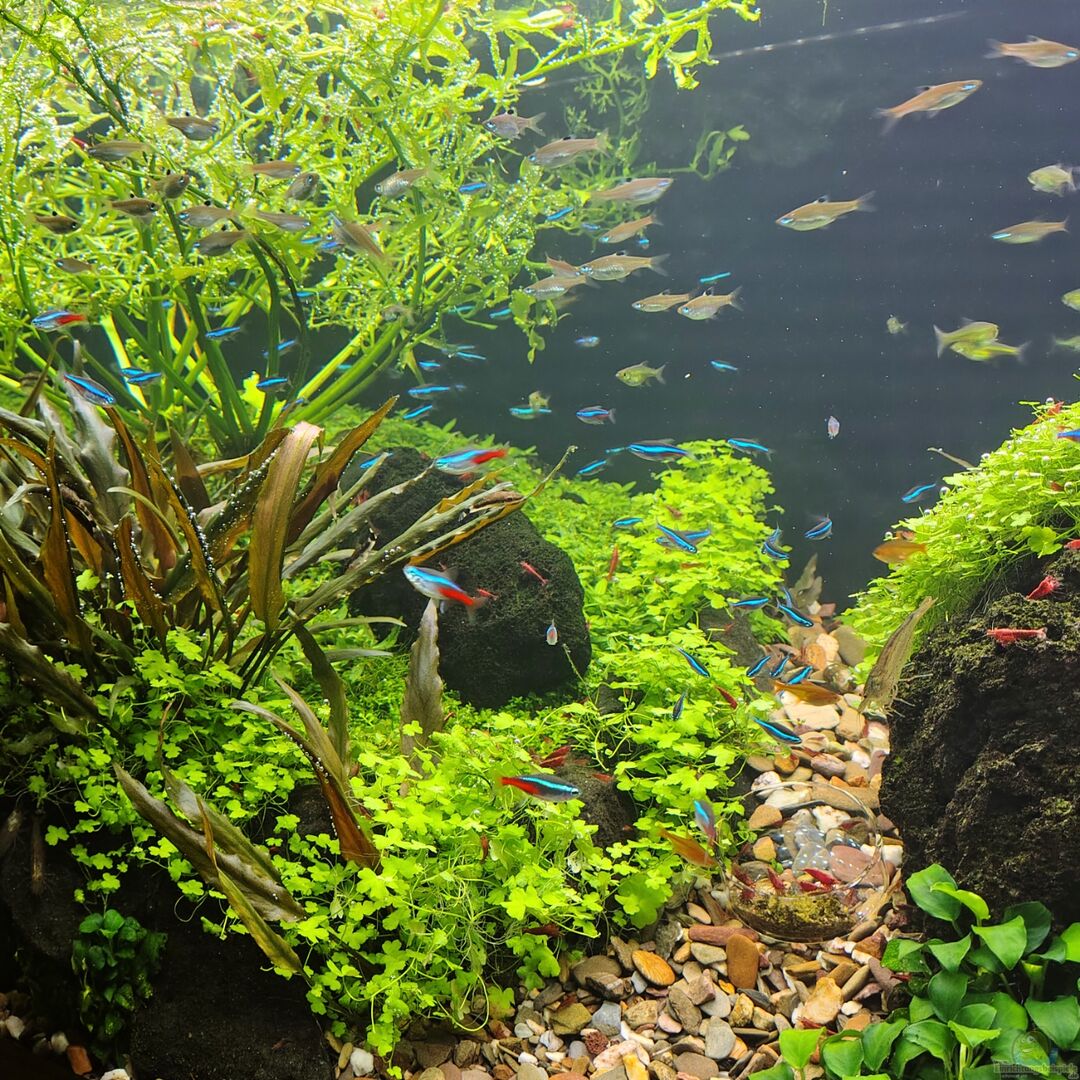 Stand: 21.12.2025 - ca. 70 - 80 blaue Neonsalmler - ca. 12 Neontetra - ca. 50 Augenfleckbärblinge - ca. 50 Funkensalmler (auch Feuersalmler genannt) - ca. 30 Microdevario kubotai - 6 Otocinclus sp. (hoppei?) - ca. 15 Amanogarnelen - unzählige Neocaridina davidi rot - Geweihschnecken - Stahlhelmschnecken -> als Beifang aus dem Handel habe ich 2 Querstreifenbärblinge dabei, die sehr hübsch sind (werde ich vermutlich aufstocken).