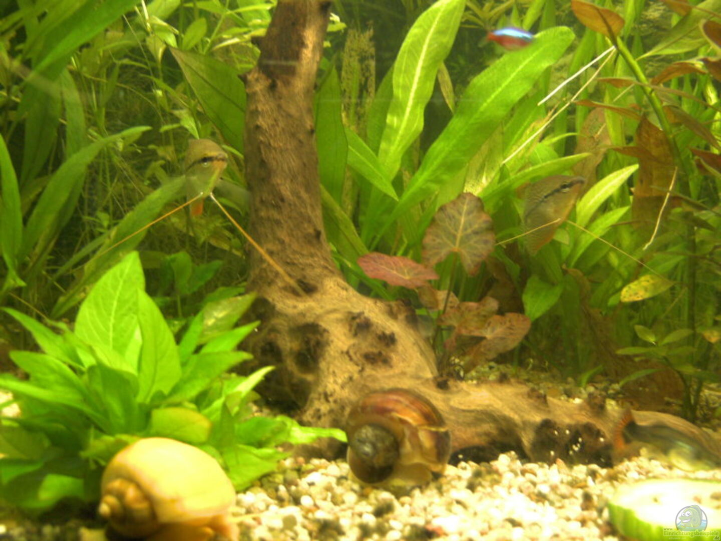 Gesellschaftsaquarium: Guppys (Poecilia reticulata) - [m4/w5] Gestreifter Ohrgitter-Harnischwels (Otocinclus macrospilus) - [5] Roter Neon (Paracheirodon axelrodi) [10] Mosaikfadenfisch (Trichogaster leerii) [m1/w2] Purpurprachtbuntbarsch (Pelvicachromis pulcher) [m1/w2 + junges m] L 162 Wels (Panaqolus maccus) [2] Amanogarnele (Caridina japonica) [8] Molukkenfächergarnele (Atyopsis moluccensis) [1] Apfelschnecke gestreift (Pomacea bridgesii) [1m] Zebra-Rennschnecke (Neritina [...]