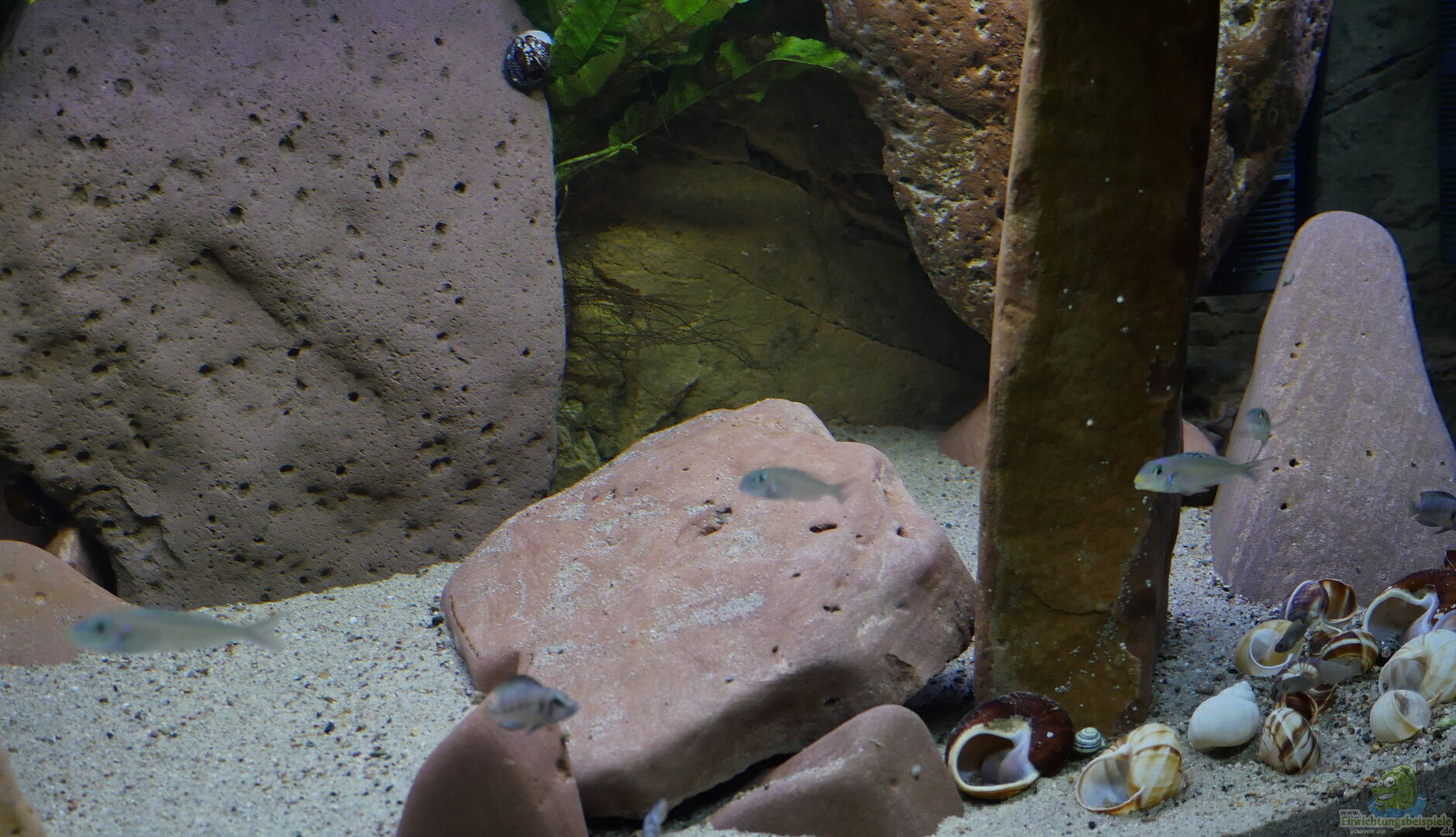Standardbecken der Firma Aquarienkontor aus Haltern am See - Glasstärke 12 mm, Front- und Seitenscheiben aus Wei??glas - Unterbau aus Aluminiumprofilen mit Scherwänden aus 15mm starken Siebdruckplatten - Eingeklebte Back to nature Slimline Red Gneis Rückwand. Ziel des Projekts war es, steile Felswände (Rückwand und hängende Felsmodule) als Lebensraum für Cyprichromis sowie eine durch stehende Felsen gut gegliederte (Reviergrenzen), sandreiche ??bergangszone nachzubilden, in der sich [...]