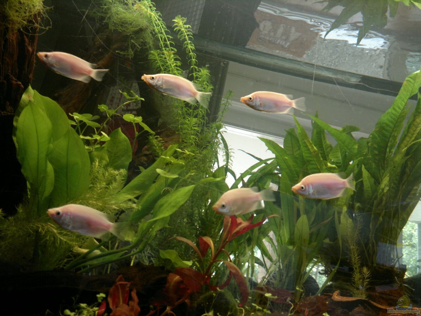 6 goldene Saugschmerlen Gyrinocheilus aymonieri var. Gold Goldfarbene Zuchtform der Wildform. Kann in freier Natur wohl bis zu 30 cm gro?? werden. In Gefangenschaft sollen 15-20 cm wohl realistischer sein. Jungtiere können im Schwarm gehalten werden. Je älter und grö??er die Tiere werden desto aggresiver werden sie aber vor allem gegenüber Artgenossen. Ursprünglich stammt dieser Fisch aus Südostasien und lebt dort vor allem in strömungsreichen Bächen. Fressen teilweise Algen - allerdings [...]