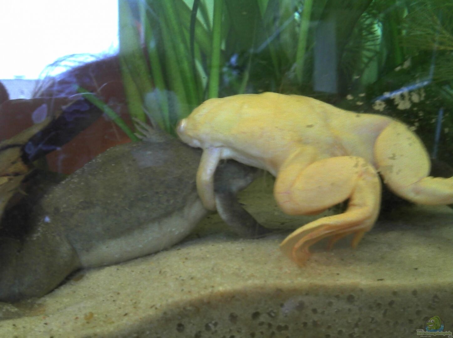 Xenopus laevis, 4 Weibchen 1 weiblicher Naturfarbender (Gitti), geboren wahrscheinlich im Sommer 2012, eingezogen am 20.04.2013, in tierärztlicher Behandlung wegen im Bein eingelagerter Lymphflüssigkeit im August 2014 (tägliche Bäder in isotonischer Kochsalzlösung) - seit Anfang 2015 symptomfrei 1 weiblicher Naturfarbender (Happy), geboren 2013, eingezogen 28.12.2014 1 weiblicher Naturfarbender (Louanne), geboren 2013, eingezogen am 28.12.2014 1 weiblicher Albino (Gemma), geboren [...]