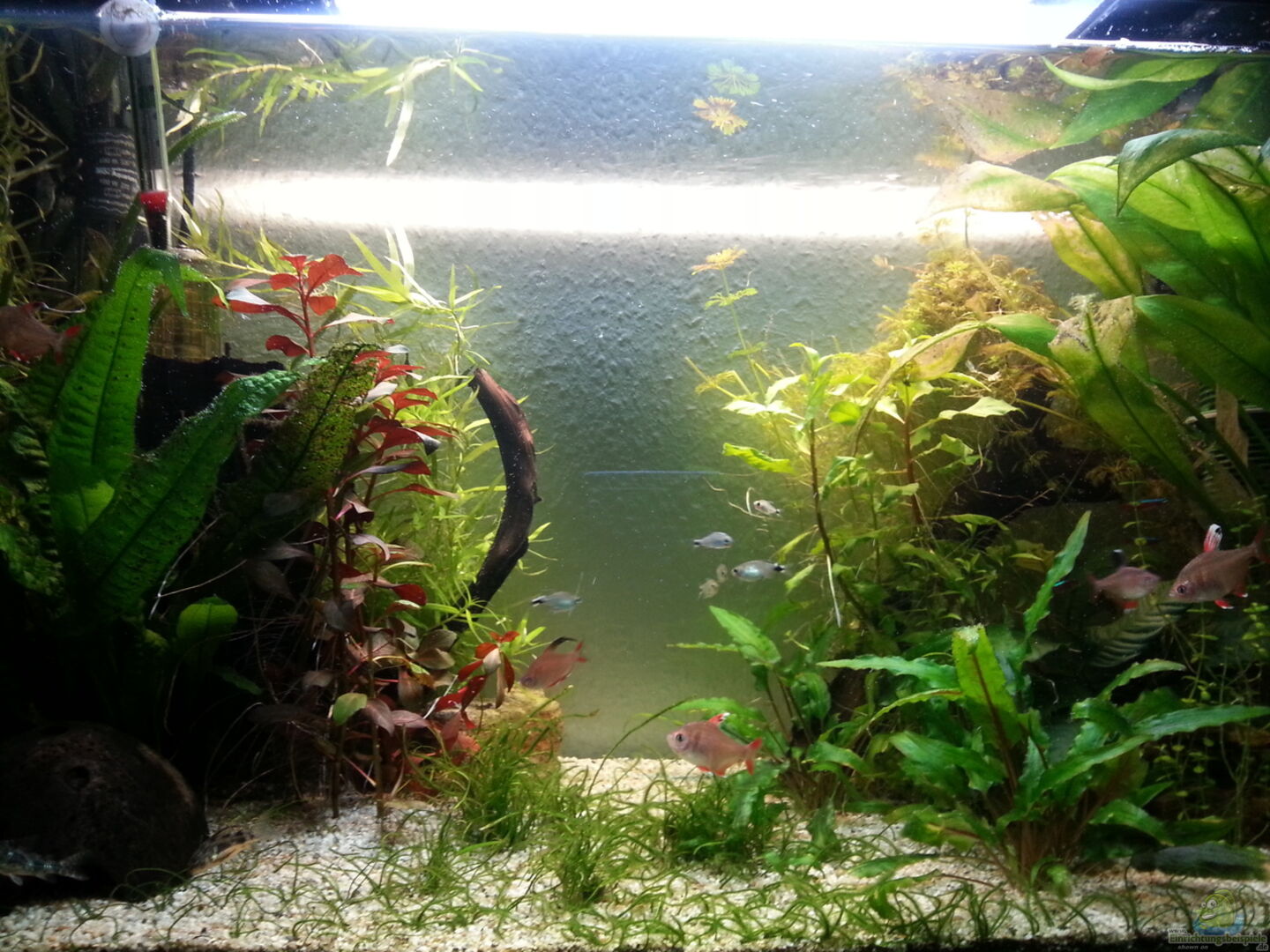 Hintergrund: -Riesen vallisneria -Eleocharis sp. -Echinodorus bleherae -Limnophila sessiliflora -Heteranthera zosterifolia -Lindernia rotundifolia Mitte: -Ludwigia repens `rubin` -Anubias barteri var. coffefolia -Penthorum sedoides -Fissidens Fontanus -Eine, von der ich nicht mehr den Namen wei?? Vorne: -Alternanthera reineckii 'Mini' (nicht mehr im AQ) -Lilaeopsis mauritina Dünger: 1x wöchentlich Volldünger [...]