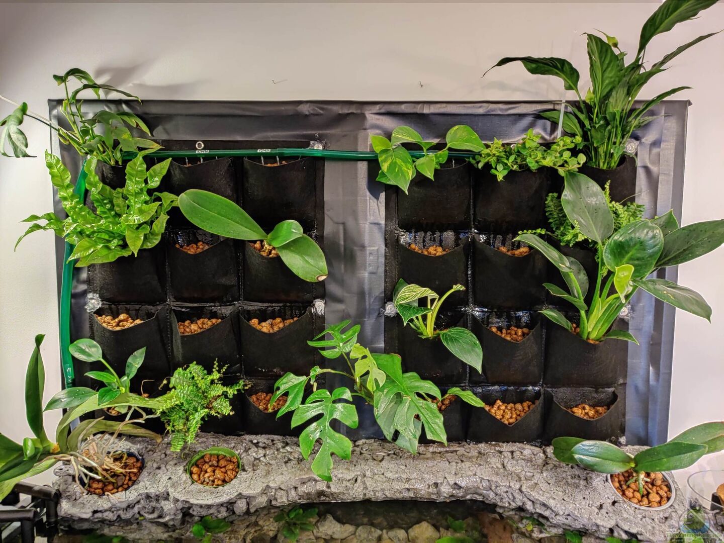 Auf der Rückseite des Aquariums befindet sich ein Alu-Stecksystem, welches mit einer Teichfolie bespannt ist. Die Teichfolie geht bis ins Aquarium und dichtet somit die Rückwand vollständig ab. Um einen ??bergang zwischen Aquarium und Rückwand zu schaffen, wurde eine 3D-Rückwand mit Montageschaum gestaltet. Dort befindet sich neben drei Einfassungen für Pflanzen im Landteil ebenfalls die Pumpe, welche mit einer Zeitschaltuhr gesteuert mehrere Male am Tag die Rückwand mit Aquariumwasser bewässert. [...]
