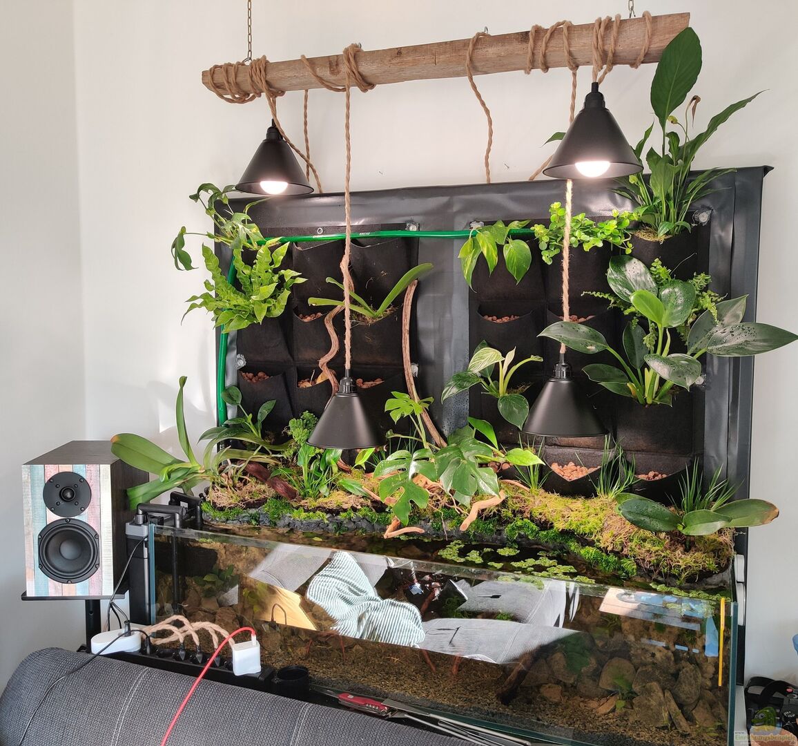 Auf der Rückseite des Aquariums befindet sich ein Alu-Stecksystem, welches mit einer Teichfolie bespannt ist. Die Teichfolie geht bis ins Aquarium und dichtet somit die Rückwand vollständig ab. Um einen ??bergang zwischen Aquarium und Rückwand zu schaffen, wurde eine 3D-Rückwand mit Montageschaum gestaltet. Dort befindet sich neben drei Einfassungen für Pflanzen im Landteil ebenfalls die Pumpe, welche mit einer Zeitschaltuhr gesteuert mehrere Male am Tag die Rückwand mit Aquariumwasser bewässert. [...]