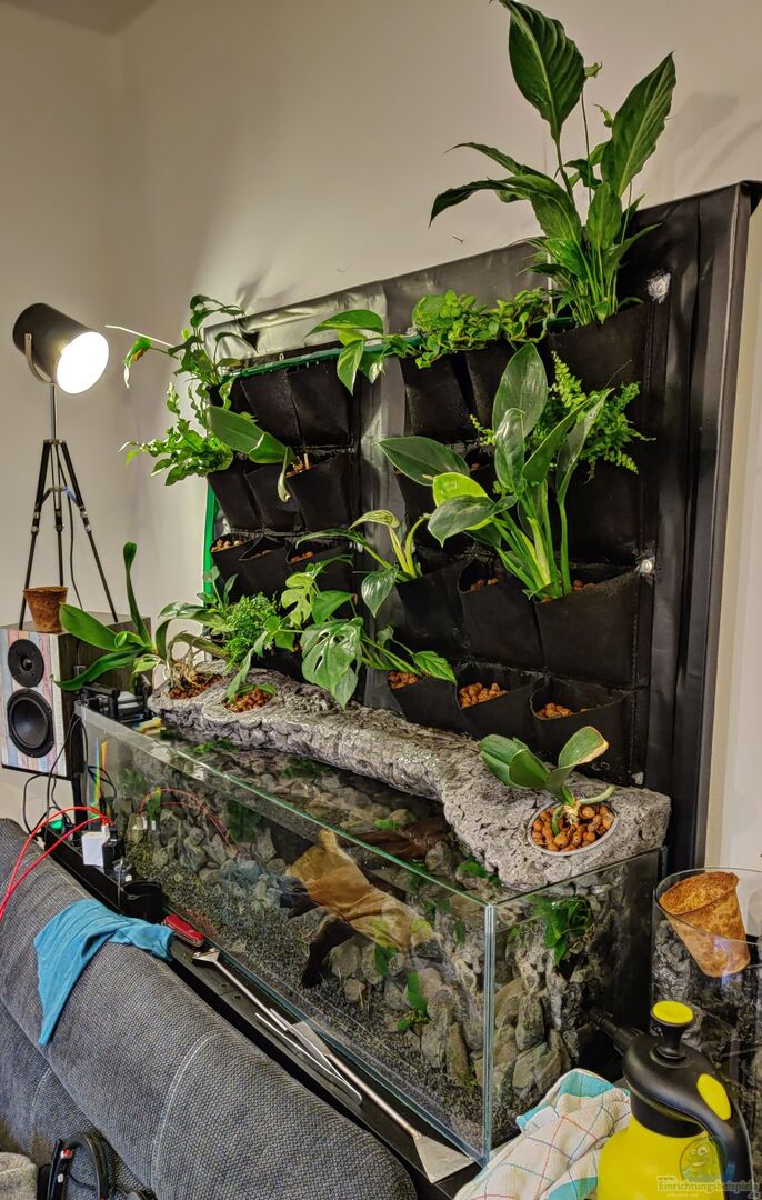 Auf der Rückseite des Aquariums befindet sich ein Alu-Stecksystem, welches mit einer Teichfolie bespannt ist. Die Teichfolie geht bis ins Aquarium und dichtet somit die Rückwand vollständig ab. Um einen ??bergang zwischen Aquarium und Rückwand zu schaffen, wurde eine 3D-Rückwand mit Montageschaum gestaltet. Dort befindet sich neben drei Einfassungen für Pflanzen im Landteil ebenfalls die Pumpe, welche mit einer Zeitschaltuhr gesteuert mehrere Male am Tag die Rückwand mit Aquariumwasser bewässert. [...]