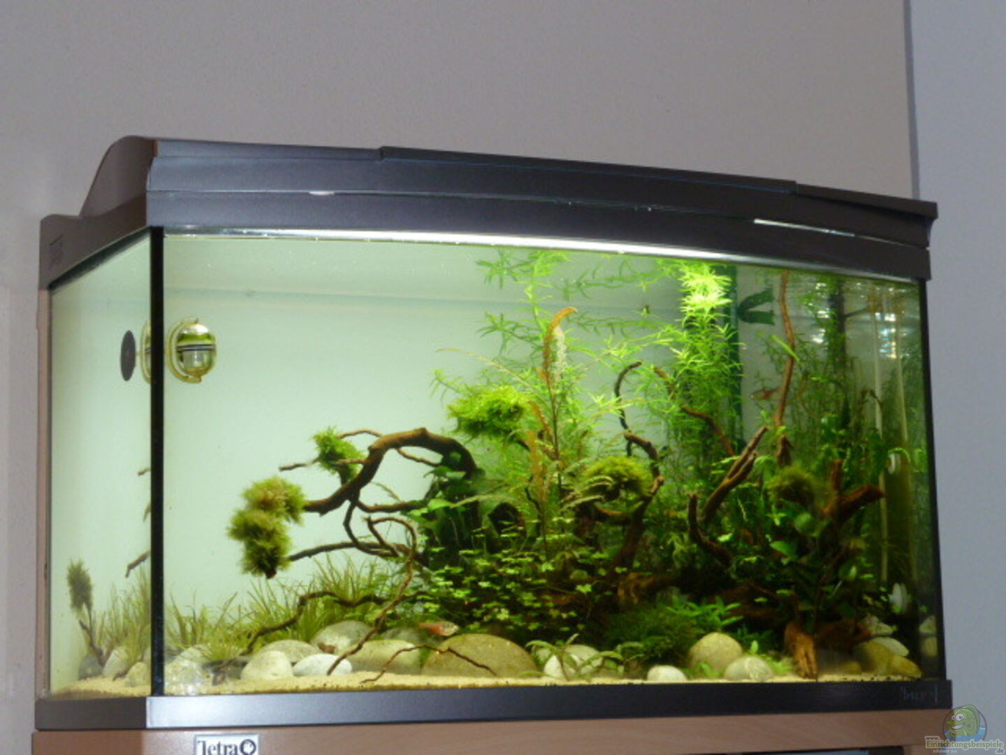 Becken hat eine gebogene Frontscheibe. Aufgrund dessen hat es lediglich 100 Liter. Hintere Scheibe wurde mit Milchglasfolie beklebt. DIY Hintergrundbeleuchtung mit Sonnenauf- und Sonnenuntergang.