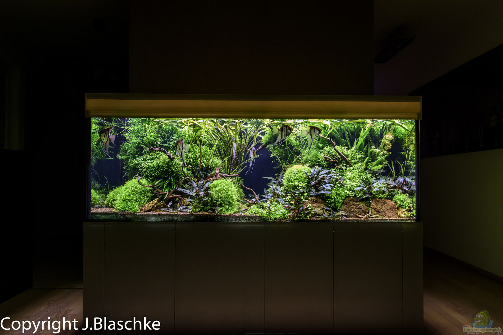 Sonderanfertigung der Firmen Aquariumbau Graf / Aquarium West München; Front- und Seitenscheiben in Wei??glas 15mm, Schwarzglasschacht hinten rechts (38 cm lang x 13 cm tief) mit - 4 Bohrungen für 2x Filterabläufe/-zuläufe, - 2 Bohrungen für Wasserüberlauf, Alu-Rahmen-Unterbau; Verkleidung des Unterbaus mit wei?? lackiertem Glas; Zeitgesteuerter Zulauf von Roh- und Osmosewasser (Durchlaufbecken),