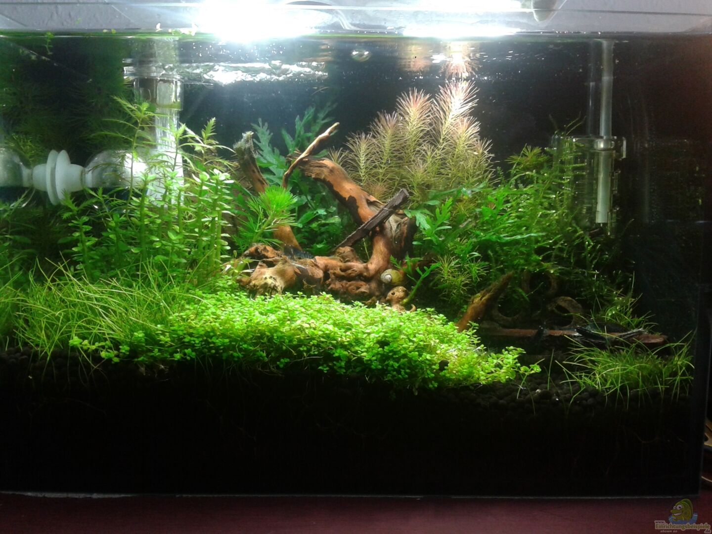 Zuchtbecken für blaue Tigergarnelen. Alle 3 Becken sind ein wenig im Aquascaping-Stil angelegt und sind durch den starken Pflanzenwuchs passend für die Bedürfnisse der Garnelen eingerichtet. Rückscheibe + eine Seitenscheibe sind für mehr Tiefenwirkung mit schwarzer Folie beklebt.
