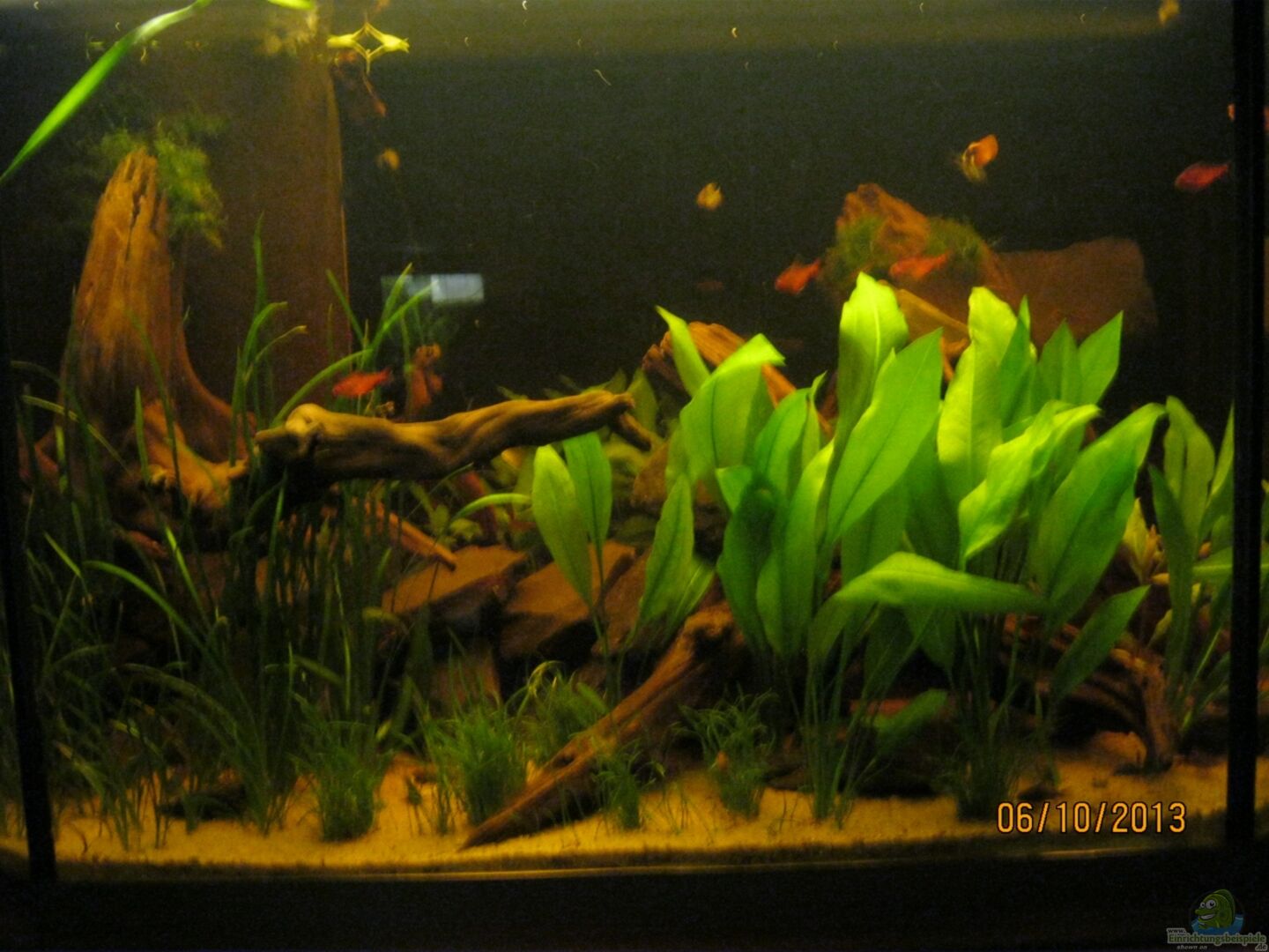 Das Aquarium ist aus 12mm Glas mit schwarzem Silikon verklebt. Bodenbohrungen sind nicht vorhanden. Das Becken steht auf einem 25 x 25 mm Stahlrohrgestell, unter dem Gestell eine 10mm Siebdruckplatte, auf der Unterseite mit Teppichboden beklebt um Unebenheiten in den Bodenfliesen auszugleichen. Auf dem Rohrgestell befindet sich eine 20 mm Spanplatte darauf eine Styroporplatte mit 10 mm Dicke. Die Rückwand und die linke Seitenscheibe sind mit einer schwarzen Folie beklebt und mit 10mm Styroporplatte [...]
