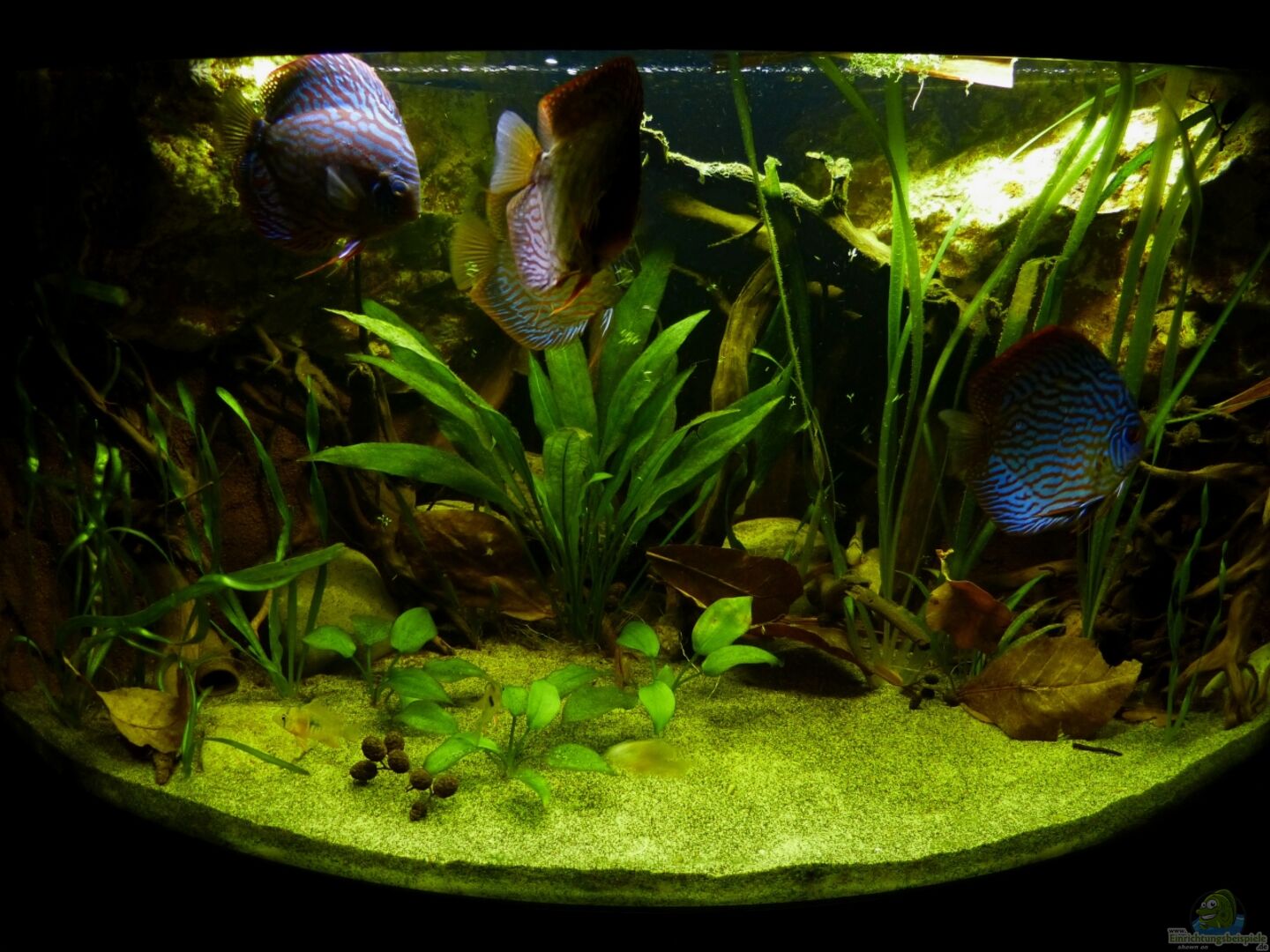 Ein paar Daten zum Aquarium vorweg: - wei??es Juwel Trigon 350 auf wengefarbenem Unterschrank mit wei??en Türen Schenkellänge 87 cm max.Tiefe 87 cm Gesamtbreite ca. 123 cm Floatglas: 15 mm - selbstgebauter Innenfilter in der hinteren Ecke - Aquarienabdeckung mit 2 Leuchtbalken, eigentlich mit 2 x 45 Watt T5 und 2 x 24 Watt T5 Leuchtbalken. Diese wurden auf LED-Beleuchtung "umgebaut"