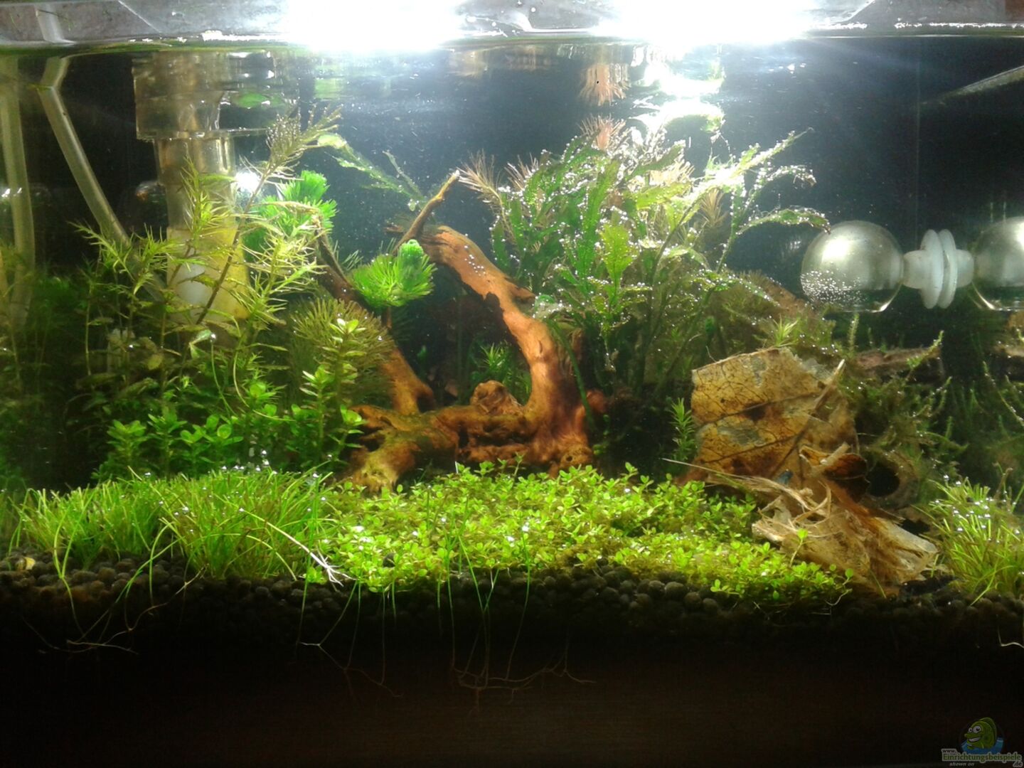 Zuchtbecken für blaue Tigergarnelen. Alle 3 Becken sind ein wenig im Aquascaping-Stil angelegt und sind durch den starken Pflanzenwuchs passend für die Bedürfnisse der Garnelen eingerichtet. Rückscheibe + eine Seitenscheibe sind für mehr Tiefenwirkung mit schwarzer Folie beklebt.